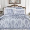 Спокойный, благородный голубой цвет; изящный рисунок жаккарда и нежное, воздушное кружево придают комплекту необыкновенную легкость и торжественность.