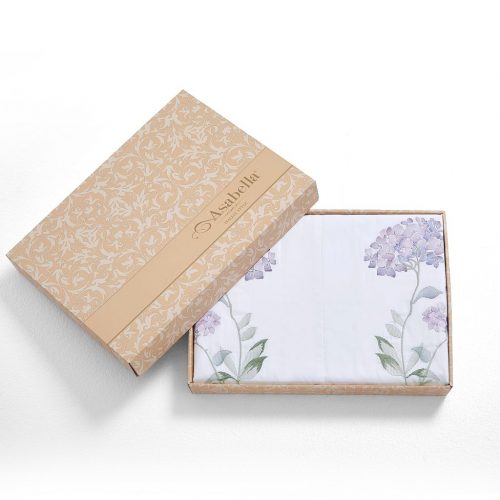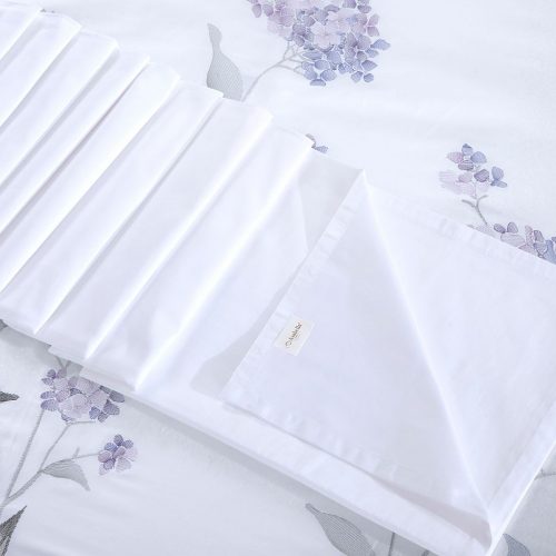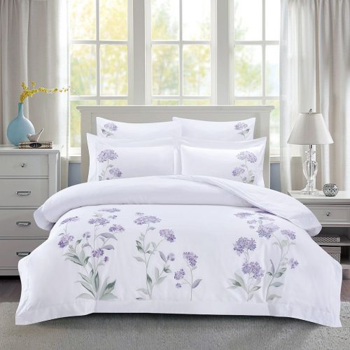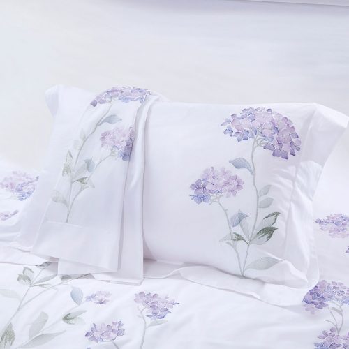 Кипельно-белый египесткий хлопок с многоцветной объемной вышивкой пышных шаровидных и зонтичных соцветий пронзительных лавандово-сиреневых гортензии в цвете сорта Гертруд Гленн.