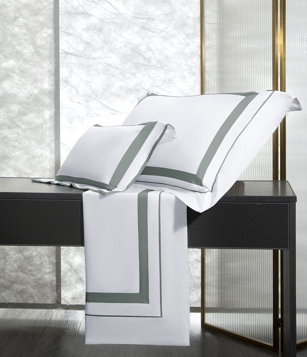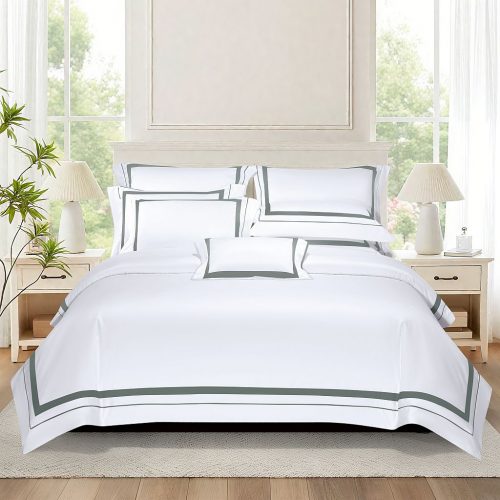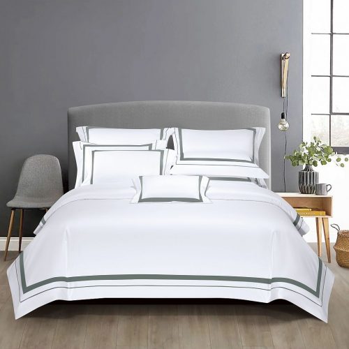 Классика жанра! Строгие линии, кипельно-белый цвет, канты спокойного шалфеевого цвета. Данный дизайн вне времени, расстояний, погоды, изменений моды, интерьеров и прочих условностей) Такой комплект всегда актуален: как подарок или комплимент. Для него всегда найдется нужное настроение.