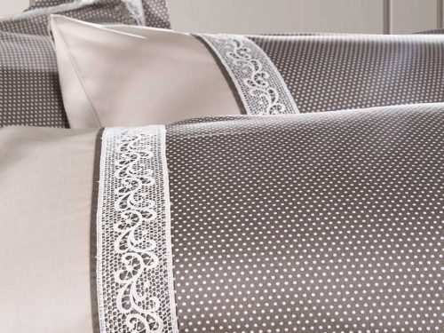 Хит коллекции Asabella! Очаровательный мелкий горох на серо-бежевом фоне настолько гармонично сочетается с белоснежным кружевом, что в этот комплект многие влюбляются с первого взгляда! В нём есть всё: и роскошь, и простота и эксцентричность! Комплект выполнен из 100% ЕГИПЕТСКОГО ДЛИННОВОЛОКНИСТОГО ХЛОПКА – ткань шелковистая, нежная, располагающая к комфортному и приятному сну.