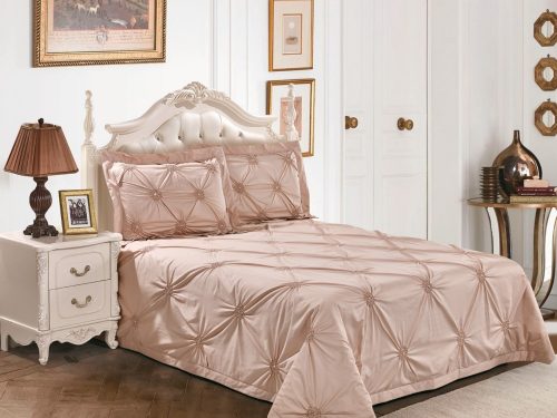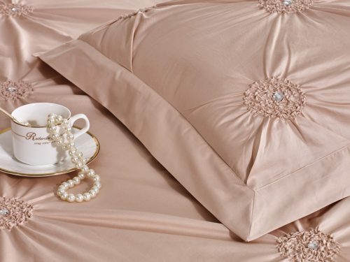 Шикарное дизайнерское покрывало нежного пудрового цвета! Стянутая резиночками изнутри ткань собирается в «цветочки» с сердцевиной из страз. За счет этого покрывало приобретает поистине королевский вид!