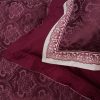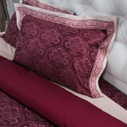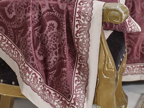 Строгий, выдержанный рисунок удачно сочетается с причудливой вышивкой на светлых ушках. Богатый, насыщенный цвет бордо завораживает своей глубиной. Несомненно, комплект будет радовать вас долгие годы как дорогое выдержанное вино.