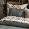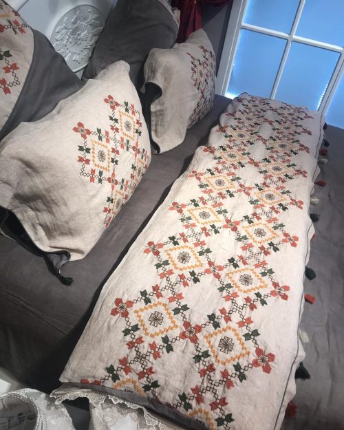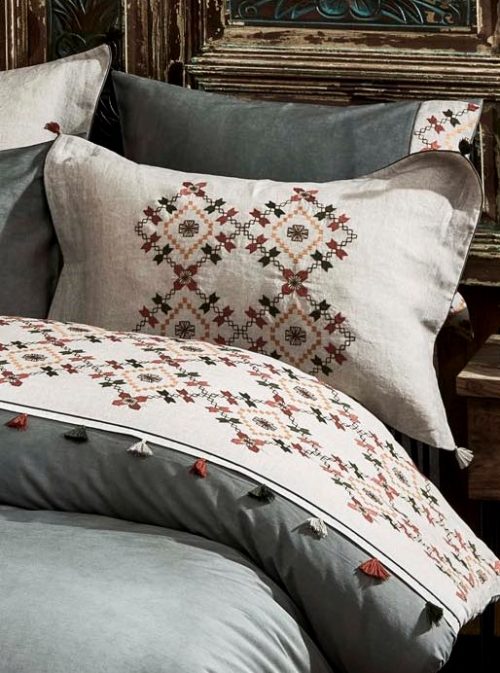 Отделка пододеяльника и двух наволочек вышивкой и декоративными "кисточками".
