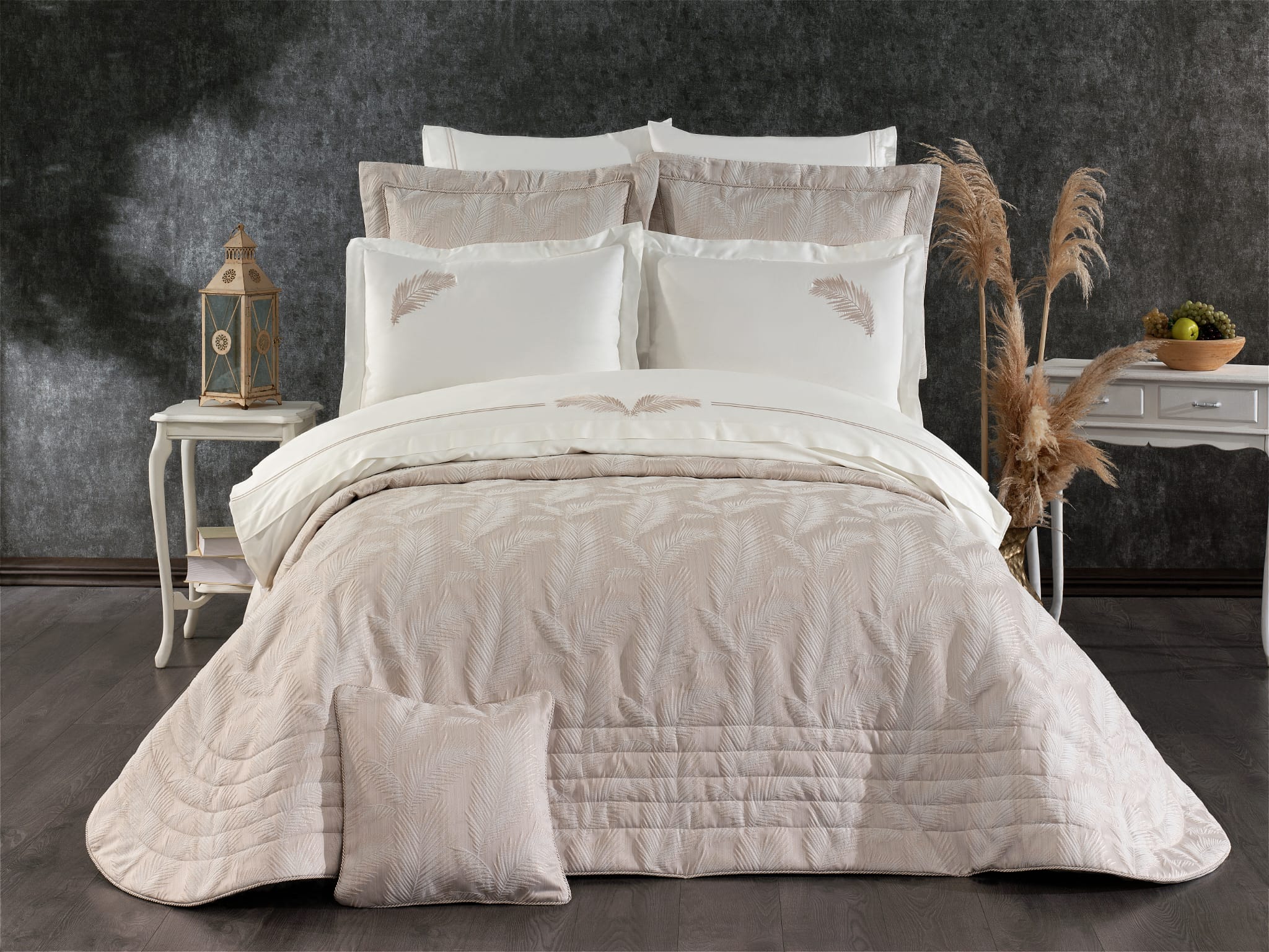 Великолепная коллекция покрывал Grazie HOME — это истинное воплощение роскоши. Фактурные орнаменты сочетаются с декоративной поверхностью покрывала, а мягкий кант прекрасно дополняет дизайн, превращая кровать в царское ложе! Покрывало выполнено из полиэстера в сочетании с сатином. Наполнение — тонкий синтепон. Полиэстер удивительно прочный и долговечный материал, он не блекнет на солнце и не теряет своих красок даже при многократных стирках, он не мнется и не электризуется, прочный и легкий — он долгие годы будет радовать Вас своим первоначальным видом, а нежный натуральный хлопок в составе делает изделие мягким и гипоаллергенным. Так же в комплект входят 2 наволочки 50×70 см и 1 наволочка 45×45 см в идентичном дизайне.