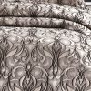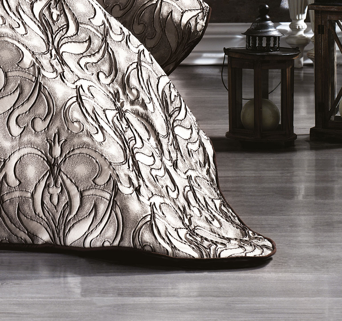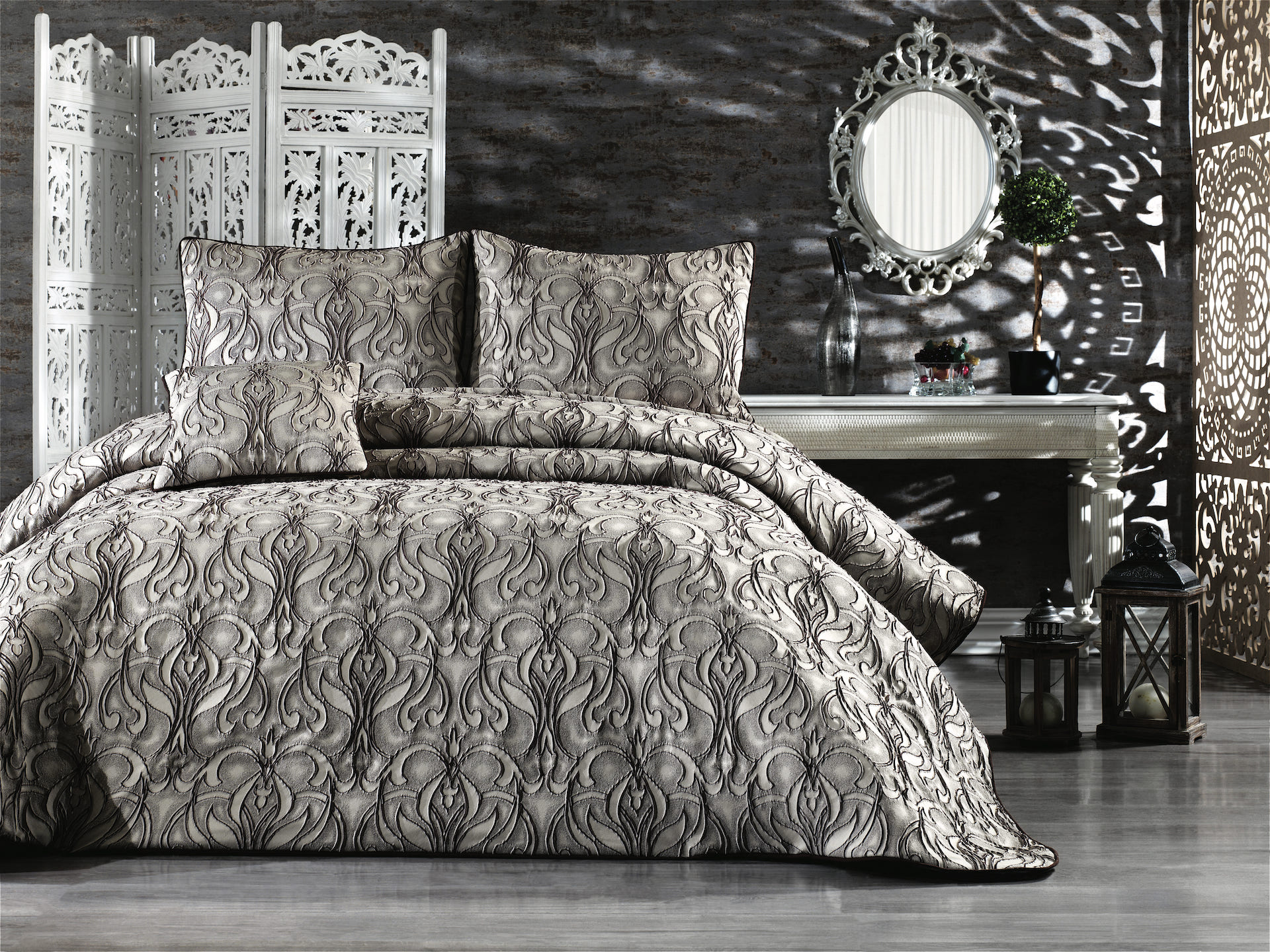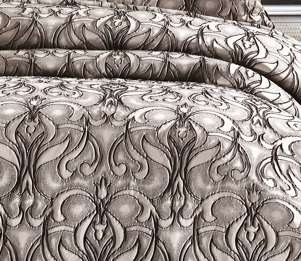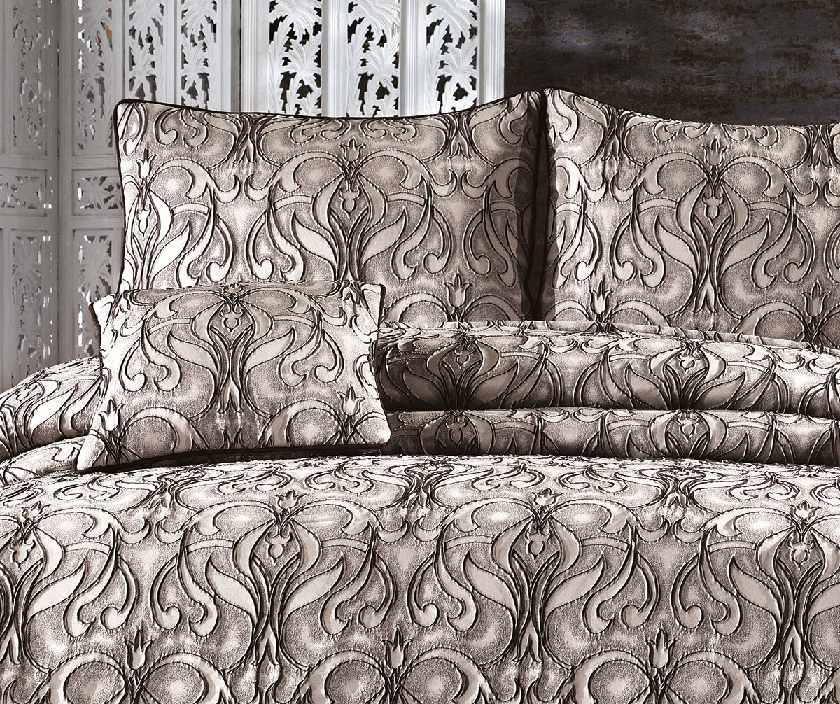 Великолепная коллекция жаккардовых покрывал Milano — это истинное воплощение роскоши. Фактурные жаккардовые орнаменты сочетаются с декоративной поверхностью покрывала, а мягкий кант прекрасно дополняет дизайн, превращая кровать в царское ложе! Покрывало выполнено из полиэстера в сочетании с сатином. Наполнение — тонкий синтепон. Полиэстер удивительно прочный и долговечный материал, он не блекнет на солнце и не теряет своих красок даже при многократных стирках, он не мнется и не электризуется, прочный и легкий — он долгие годы будет радовать Вас своим первоначальным видом, а нежный натуральный хлопок в составе делает изделие мягким и гипоаллергенным. Так же в комплект входят 2 наволочки 50×70 см и 1 наволочка 45×45 см в идентичном дизайне.