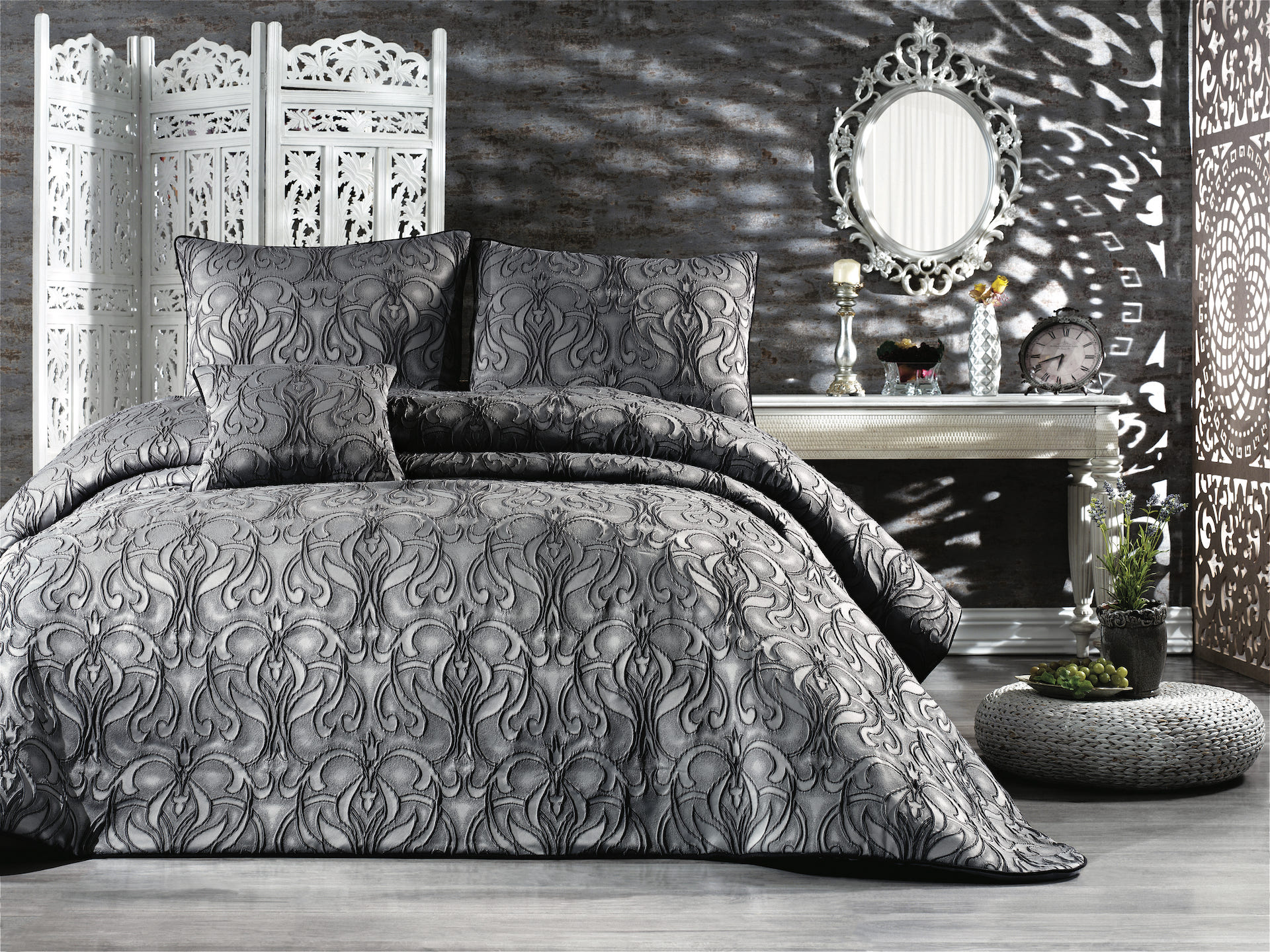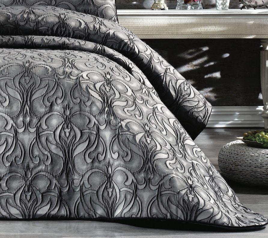Великолепная коллекция жаккардовых покрывал Milano — это истинное воплощение роскоши. Фактурные жаккардовые орнаменты сочетаются с декоративной поверхностью покрывала, а мягкий кант прекрасно дополняет дизайн, превращая кровать в царское ложе! Покрывало выполнено из полиэстера в сочетании с сатином. Наполнение — тонкий синтепон. Полиэстер удивительно прочный и долговечный материал, он не блекнет на солнце и не теряет своих красок даже при многократных стирках, он не мнется и не электризуется, прочный и легкий — он долгие годы будет радовать Вас своим первоначальным видом, а нежный натуральный хлопок в составе делает изделие мягким и гипоаллергенным. Так же в комплект входят 2 наволочки 50×70 см и 1 наволочка 45×45 см в идентичном дизайне.