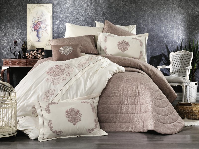 Восхитительное покрывало с жаккардовым орнаментом от турецкого производителя Grazie Home превратит даже самый обычный интерьер спальни в роскошные аппартаменты. Изысканный жаккардовый орнамент в восточном стиле делает покрывало объемным и мягким. Верх выполнен из 100% полиэстера, низ: 100% хлопок, что позволяет использовать покрывало как легкое одеяло, ведь хлопок очень экологичен и приятен к телу. По периметру покрывала идет мягкий тканевый кант. Коллекция выполнена в спокойных темных оттенках и поэтому подойдет под любой интерьер. Так же в комплект входят 3 наволочки: 50х70 см (2 шт) и 45х45 см (1 шт). Наволочки на молнии, выполнены в идентичном дизайне с покрывалом.