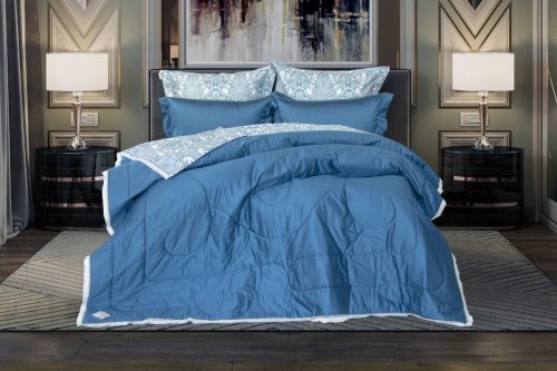 Всесезонная Коллекция «Dolce Fiore Cotton» представляет собой комплекты постельного белья и легких двусторонних одеял, в комбинации цветного и однотонного сатина высокого качества. Комплект состоит из: — Легкого Двустороннего одеяла, с оригинальным дизайном стежки, отделанное кружевом с бахрамой с 3х сторон. Легко стирается, не требует глажки, быстро высыхает, что позволяет пользоваться им в любое время года. — двух наволочек 50х70 из сатина с принтом и двух наволочек 70х70 из однотонного сатина; — простыни из сатина. Коллекция представлена в 3х комплектациях: евро, семейное, полуторное. На выбор самые популярные цвета в этом сезоне.