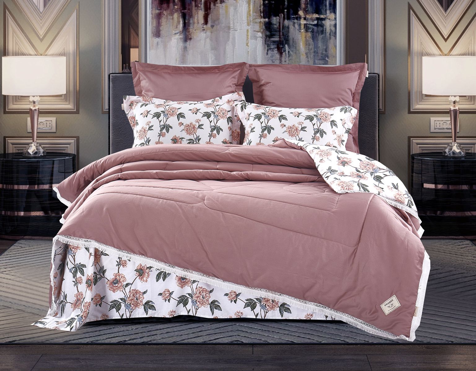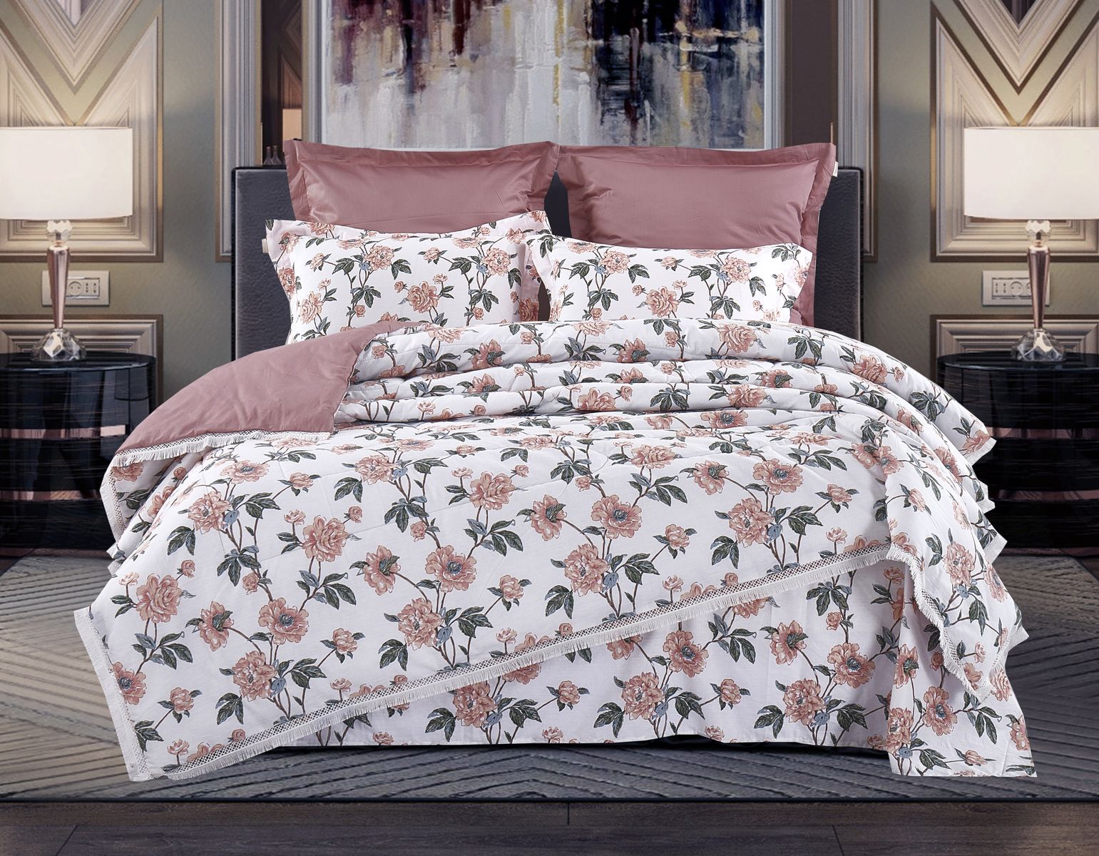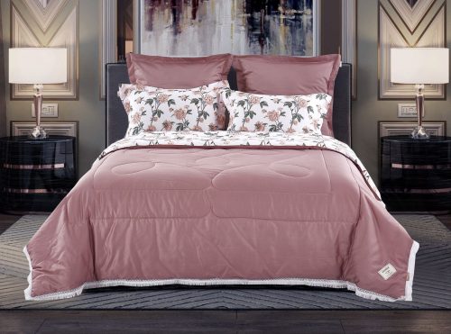 Всесезонная коллекция «Dolce Fiore Egypt Cotton» представляет собой комплекты постельного белья и легких двусторонних одеял, в комбинации цветного и однотонного сатина высокого качества. Комплект состоит из  легкого двустороннего одеяла, с оригинальным дизайном стежки, отделанное кружевом с бахрамой с 3х сторон. Легко стирается, не требует глажки, быстро высыхает, что позволяет пользоваться им в любое время года.