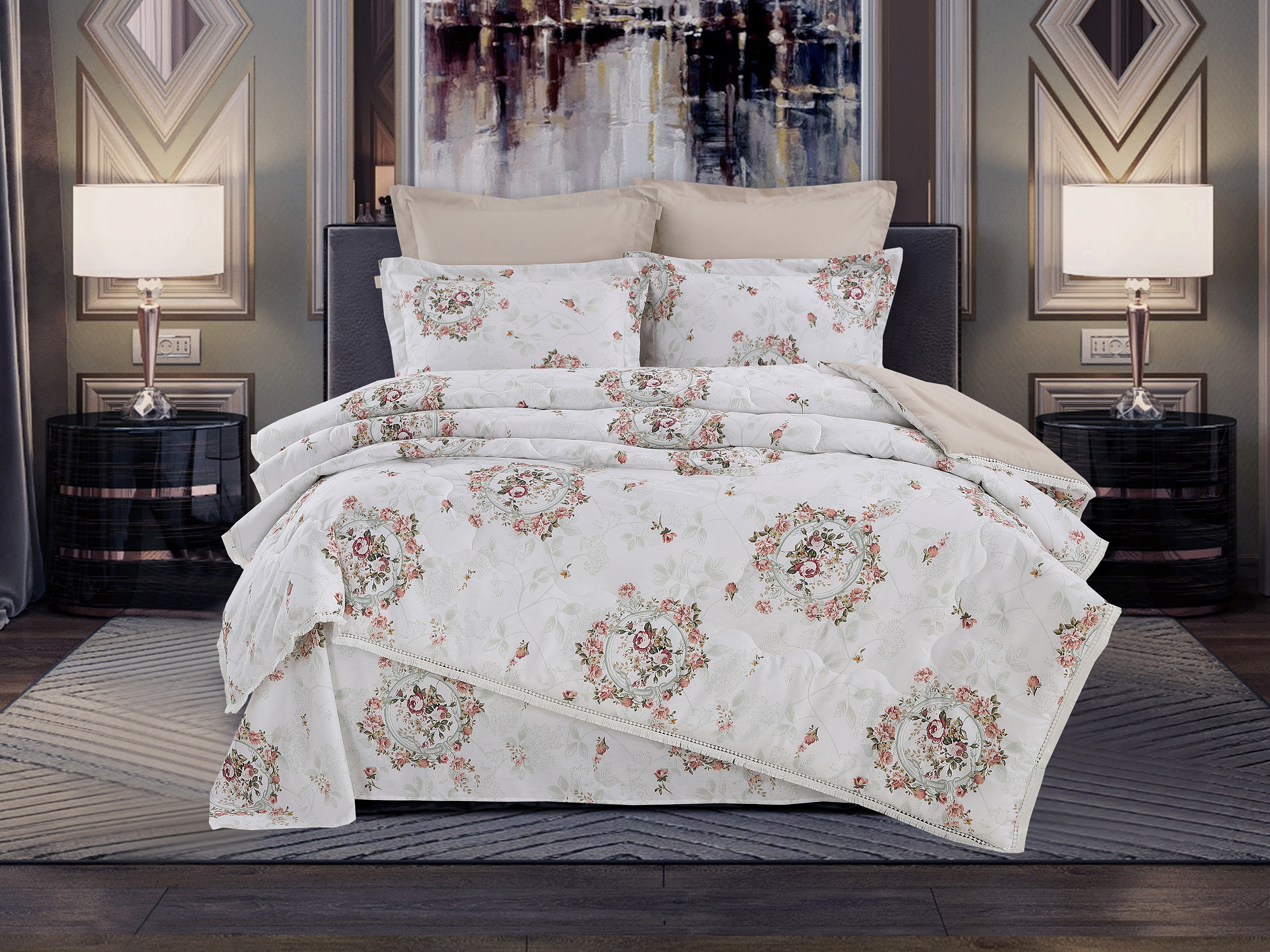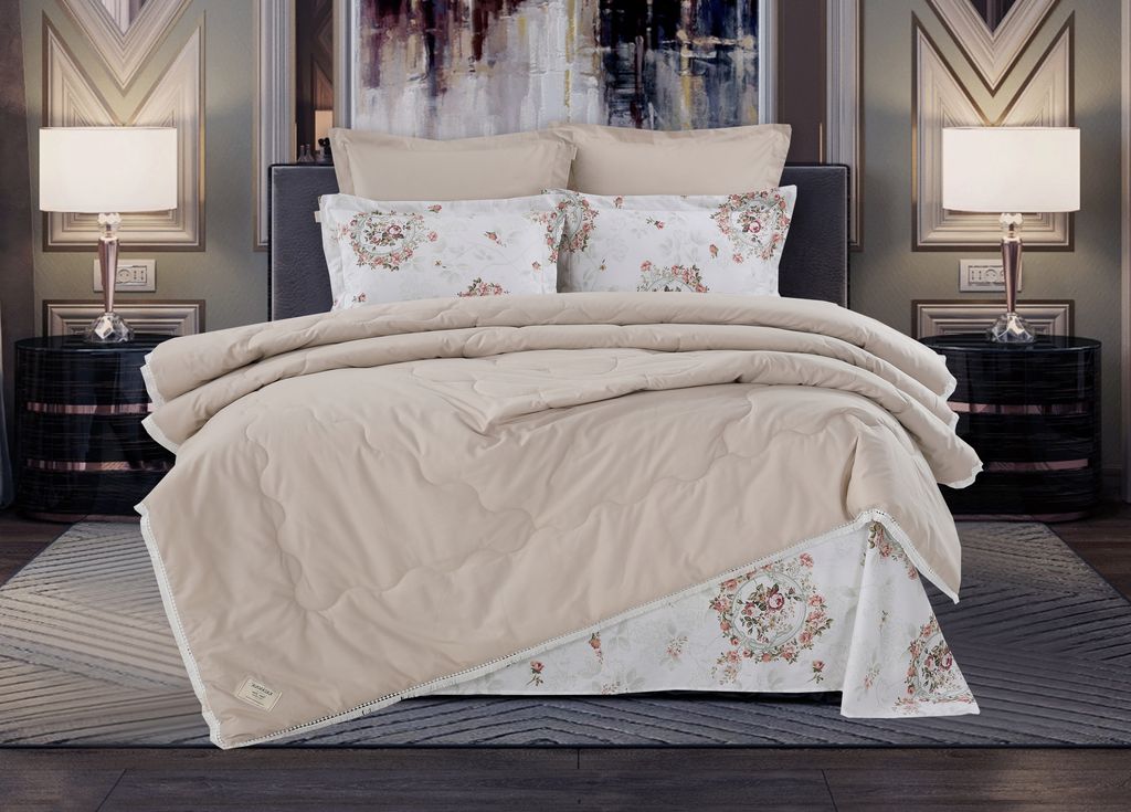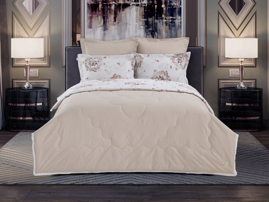 Всесезонная Коллекция «Dolce Fiore Cotton» представляет собой комплекты постельного белья и легких двусторонних одеял, в комбинации цветного и однотонного сатина высокого качества. Комплект состоит из: — Легкого Двустороннего одеяла, с оригинальным дизайном стежки, отделанное кружевом с бахрамой с 3х сторон. Легко стирается, не требует глажки, быстро высыхает, что позволяет пользоваться им в любое время года. — двух наволочек 50х70 из сатина с принтом и двух наволочек 70х70 из однотонного сатина; — простыни из сатина. Коллекция представлена в 3х комплектациях: евро, семейное, полуторное. На выбор самые популярные цвета в этом сезоне.