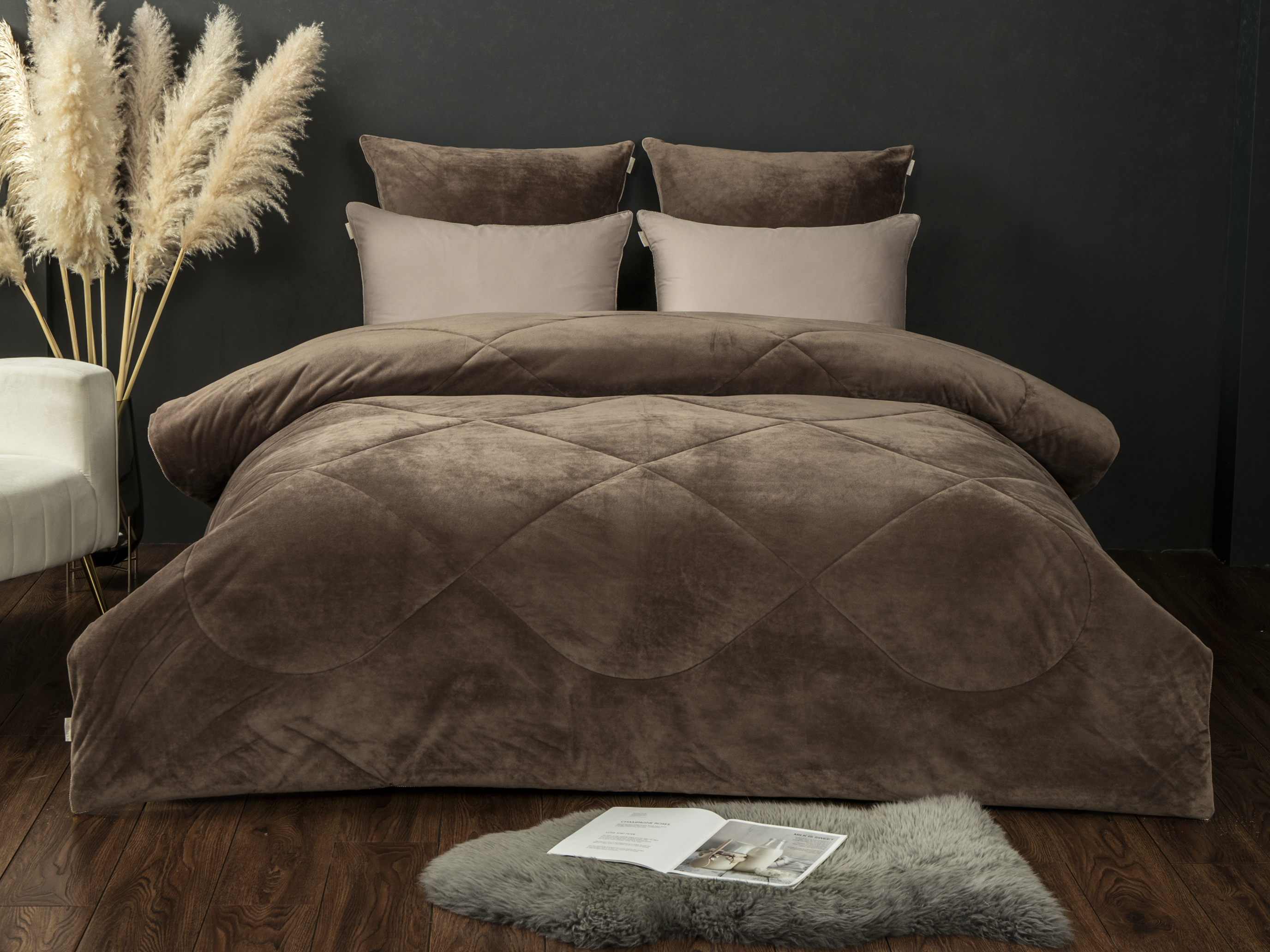 Одеяло: верхняя ткань – роскошный мягкий велюр, низ – высококачественный сатин — 100% хлопок. Наполнитель одеяла 100% микрогель. Сатиновая наволочка 50х70 — 100% хлопок. Наволочки 70х70 выполнены из комбинации нежного велюра и сатина. Простынь выполнена из сатина — 100% хлопок.