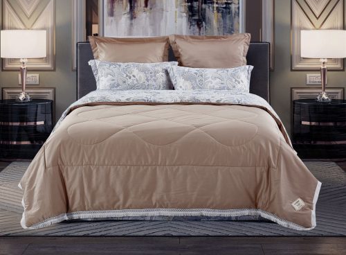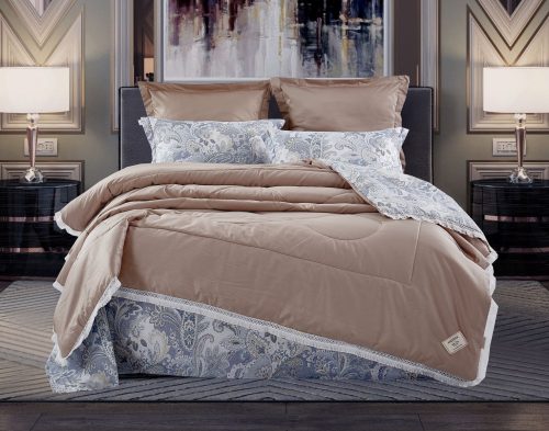 Всесезонная коллекция «Dolce Fiore Egypt Cotton» представляет собой комплекты постельного белья и легких двусторонних одеял, в комбинации цветного и однотонного сатина высокого качества. Комплект состоит из легкого двустороннего одеяла, с оригинальным дизайном стежки, отделанное кружевом с бахрамой с 3х сторон. Легко стирается, не требует глажки, быстро высыхает, что позволяет пользоваться им в любое время года.