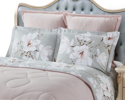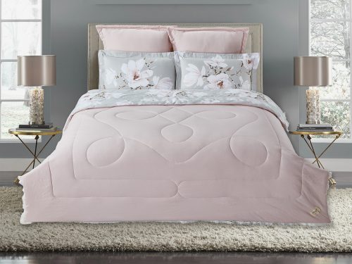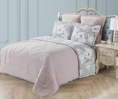 Коллекция «Dolce Fiore» представляет собой комплекты постельного белья и легких одеял, в комбинации сатина и уникальной ткани «матовый лен» (инновационная ткань льняного плетения невероятно мягкая, нежная и прохладная на ощупь). Как известно, плетение льна грубовато, но за счет добавления в ткань вискозы, ткань приобретает новые свойства — прохладу шелка и нежность хлопка. Комплект состоит из: легкого одеяла, с оригинальным дизайном стежки, отделанное кружевом с бахрамой с 3-х сторон. Двухстороннее одеяло выполненно верх — матовый лен, низ — сатин с принтом. Легко стирается, быстро высыхает, что позволяет пользоваться им в любое время года. Наполнитель: Благодаря миксу органического волокна льна и экофайбера, обладает невесомыми и облегающими свойствами, хорошей воздупроницаемостью и терморегуляцией; -двух наволочек 50х70 из сатина с принтом; -двух наволочек 70х70 из матового льна, простыни из сатина.
