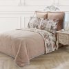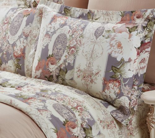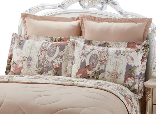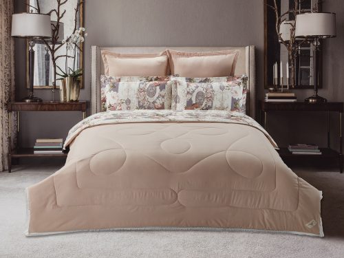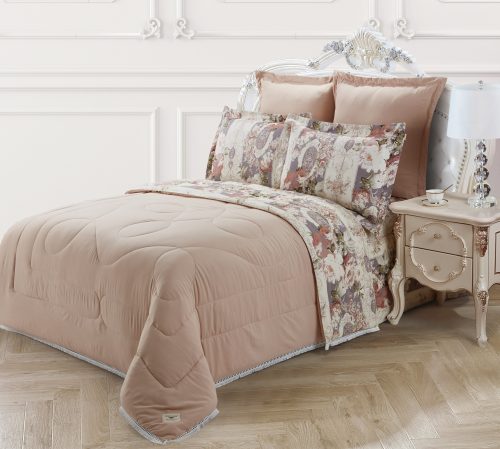 Коллекция «Dolce Fiore» представляет собой комплекты постельного белья и легких одеял, в комбинации сатина и уникальной ткани «матовый лен» (инновационная ткань льняного плетения невероятно мягкая, нежная и прохладная на ощупь). Как известно, плетение льна грубовато, но за счет добавления в ткань вискозы, ткань приобретает новые свойства — прохладу шелка и нежность хлопка. Комплект состоит из: легкого одеяла, с оригинальным дизайном стежки, отделанное кружевом с бахрамой с 3-х сторон. Двухстороннее одеяло выполненно верх — матовый лен, низ — сатин с принтом. Легко стирается, быстро высыхает, что позволяет пользоваться им в любое время года. Наполнитель: Благодаря миксу органического волокна льна и экофайбера, обладает невесомыми и облегающими свойствами, хорошей воздупроницаемостью и терморегуляцией; -двух наволочек 50х70 из сатина с принтом; -двух наволочек 70х70 из матового льна, простыни из сатина.