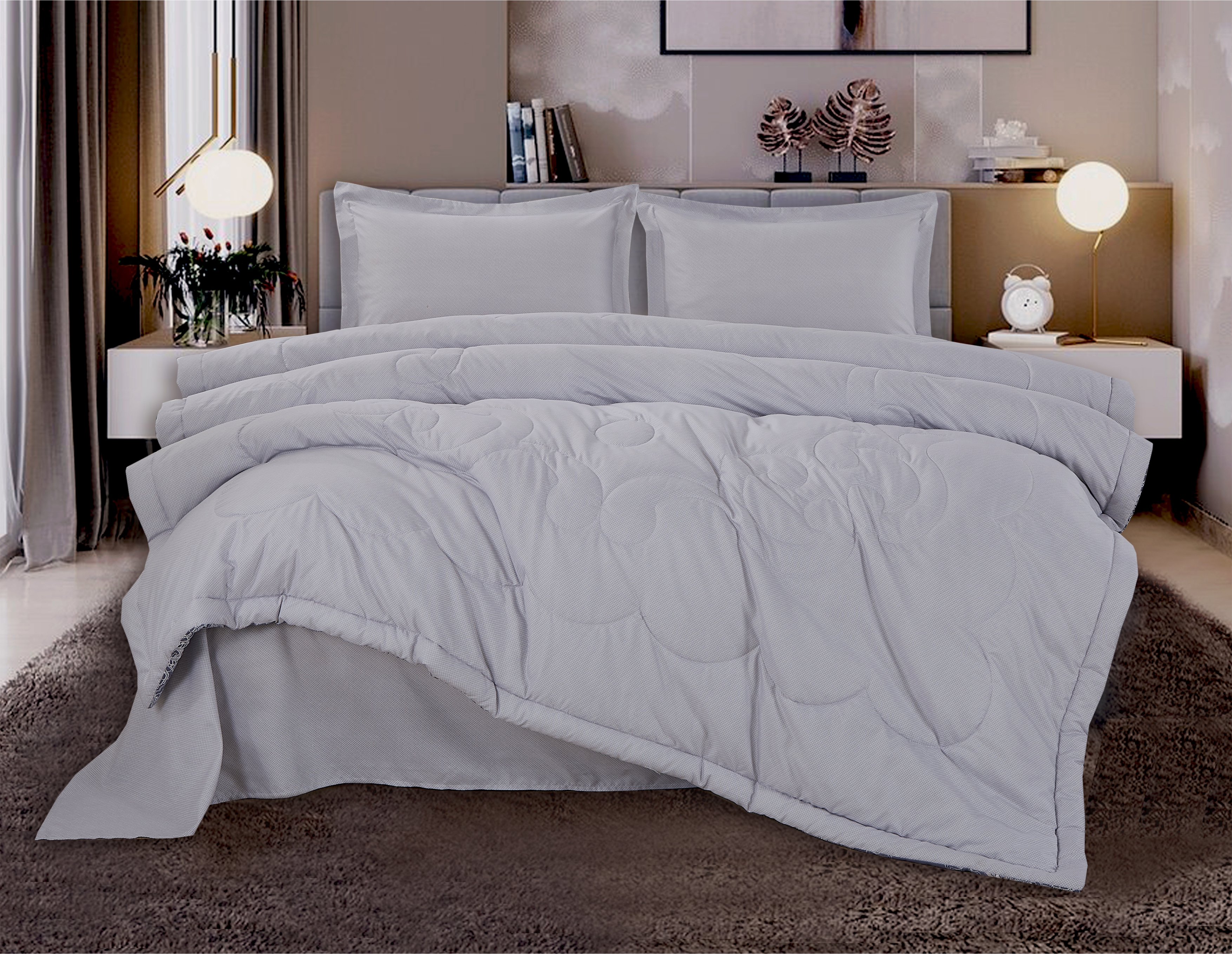 Комплект состоит из наволочек, простыни и одеяло-покрывала с оригинальным дизайном стежки, отделанное планкой с 4х сторон. Уникальным дышащим наполнителем «тинсулейт», обладающим невесомыми свойствам, что позволяет использовать его как летнее одеяло! Легко стирается и быстро сохнет. В комплекте исполузуется ткань сатинового плетения.
