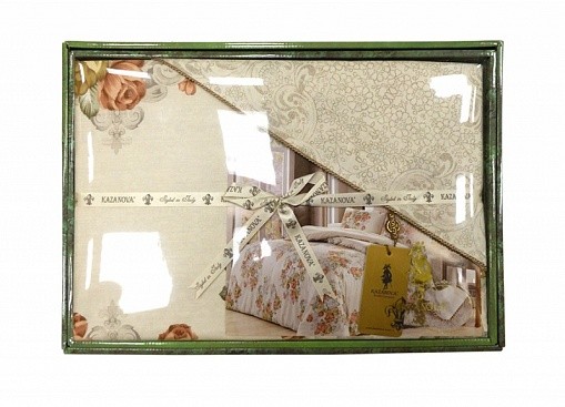 Комплекты изящно выложены в брендовую подарочную упаковку «KAZANOV.A.», выкладка подчеркивает все элементы декора комплекта: ламинированная коробка и фирменный пакет с ручками из шелковистого витого шнура