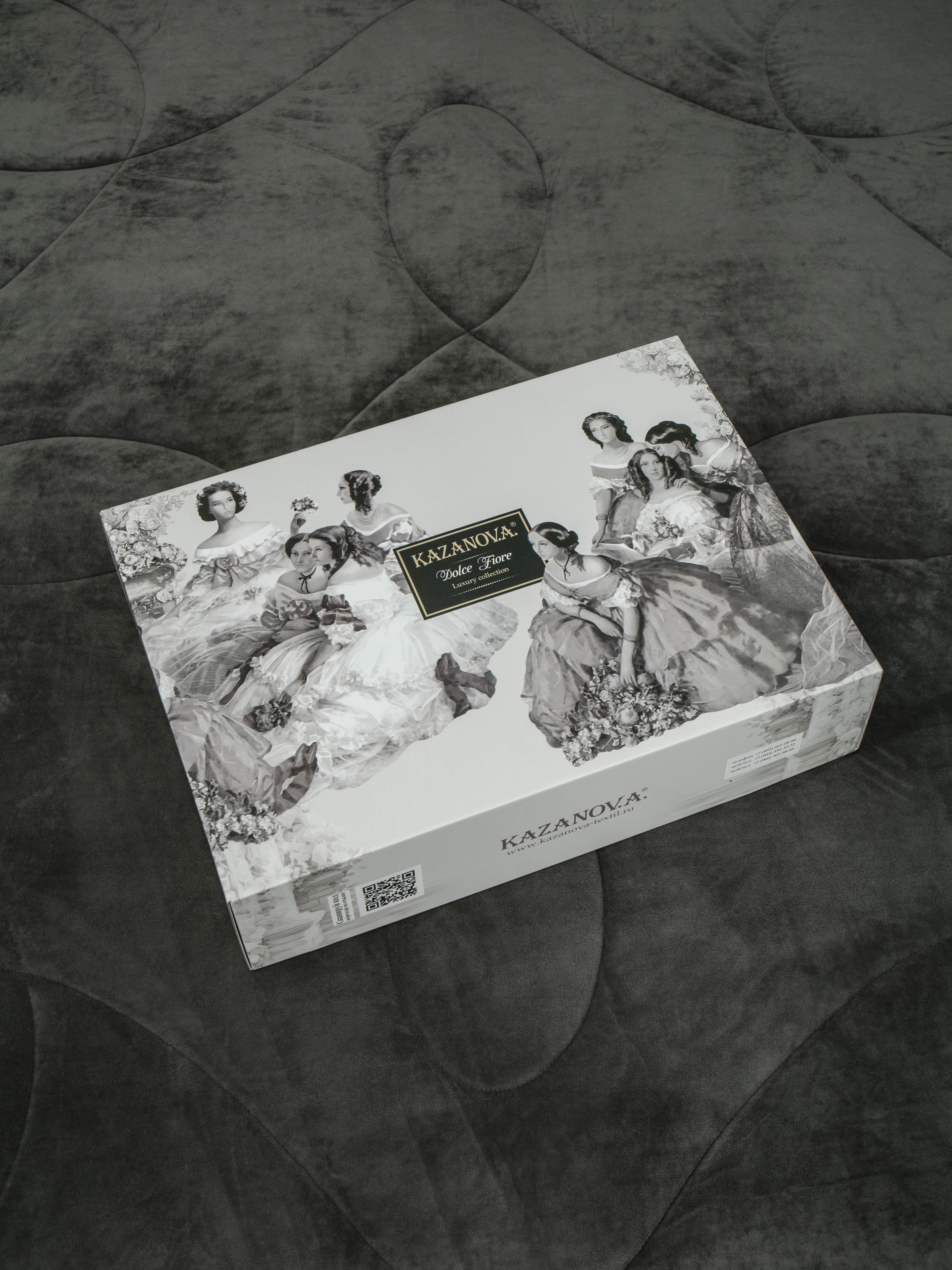 Комплекты изящно выложены в брендовую подарочную упаковку «KAZANOV.A.» с PVC ручкой.