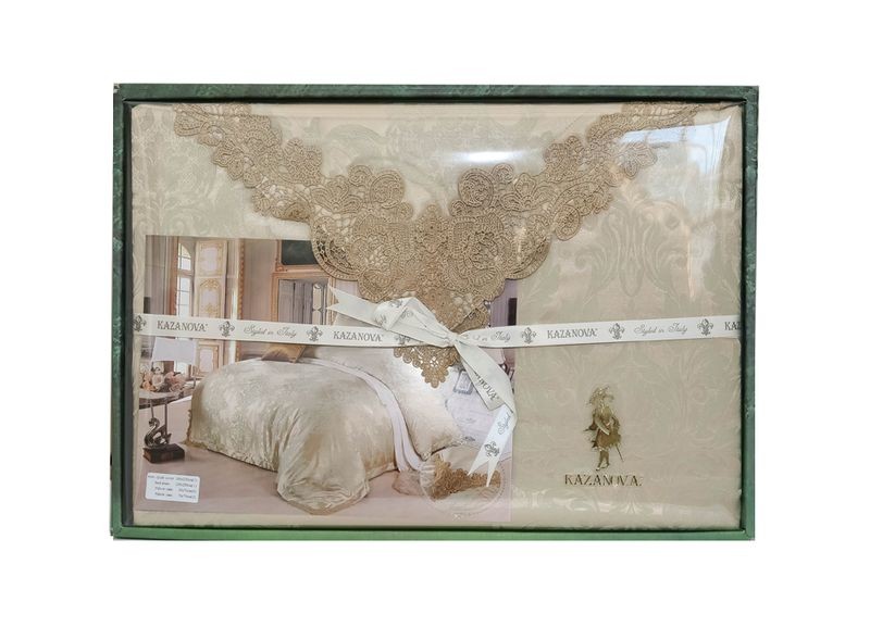 Комплекты изящно выложены в брендовую подарочную упаковку «KAZANOV.A.», выкладка подчеркивает все элементы декора комплекта: ламинированная коробка и фирменный пакет с ручками из шелковистого витого шнура