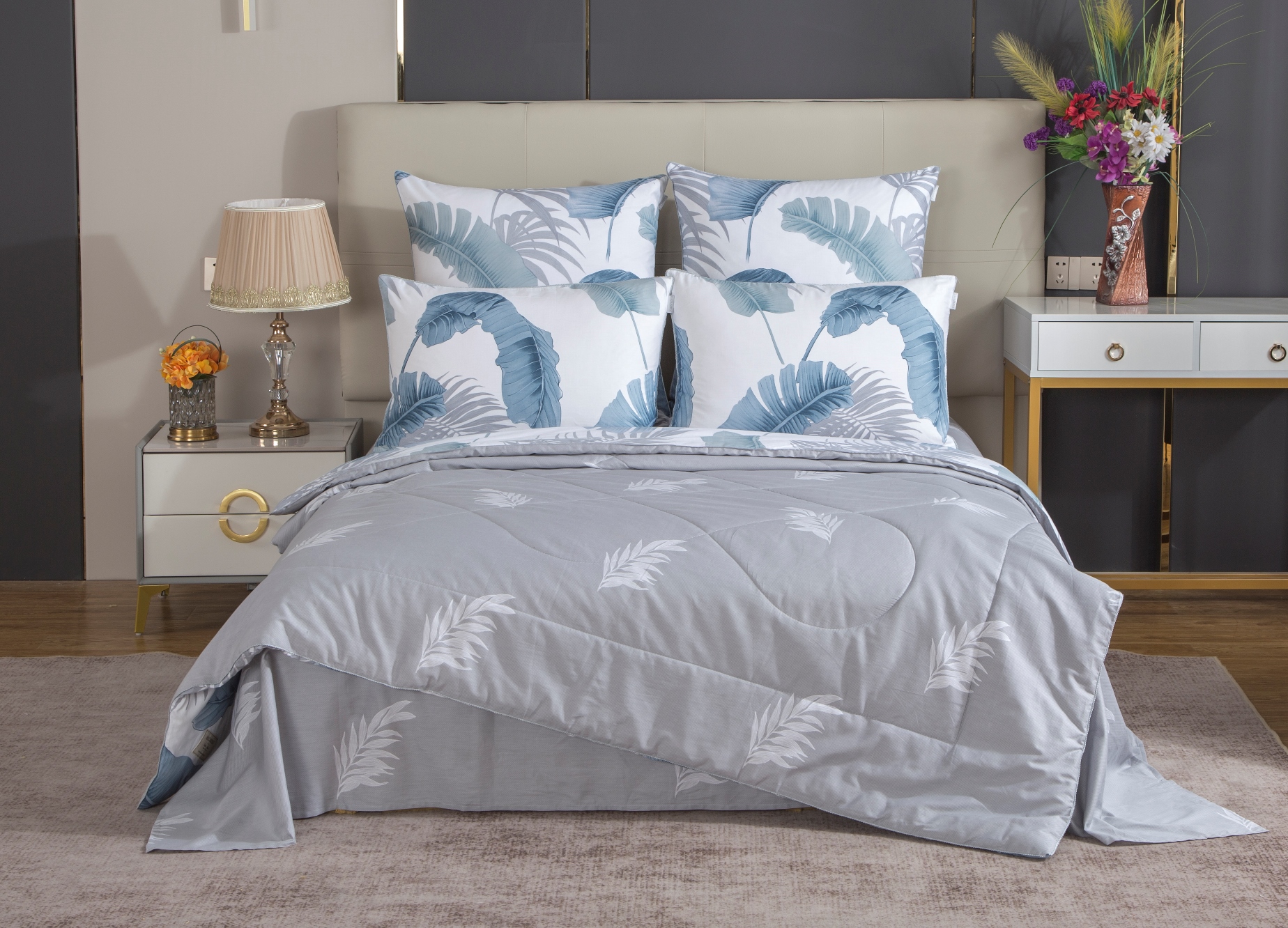 Всесезонная Коллекция «Dolce Fiore Cotton» представляет собой комплекты постельного белья и легких двусторонних одеял, в комбинации цветного и однотонного сатина высокого качества. Комплект состоит из: — Легкого Двустороннего одеяла, с оригинальным дизайном стежки, отделанное кружевом с бахрамой с 3х сторон. Легко стирается, не требует глажки, быстро высыхает, что позволяет пользоваться им в любое время года. — двух наволочек 50х70 из сатина с принтом и двух наволочек 70х70 из однотонного сатина; — простыни из сатина. Коллекция представлена в 3х комплектациях: евро, семейное, полуторное. На выбор самые популярные цвета в этом сезоне.