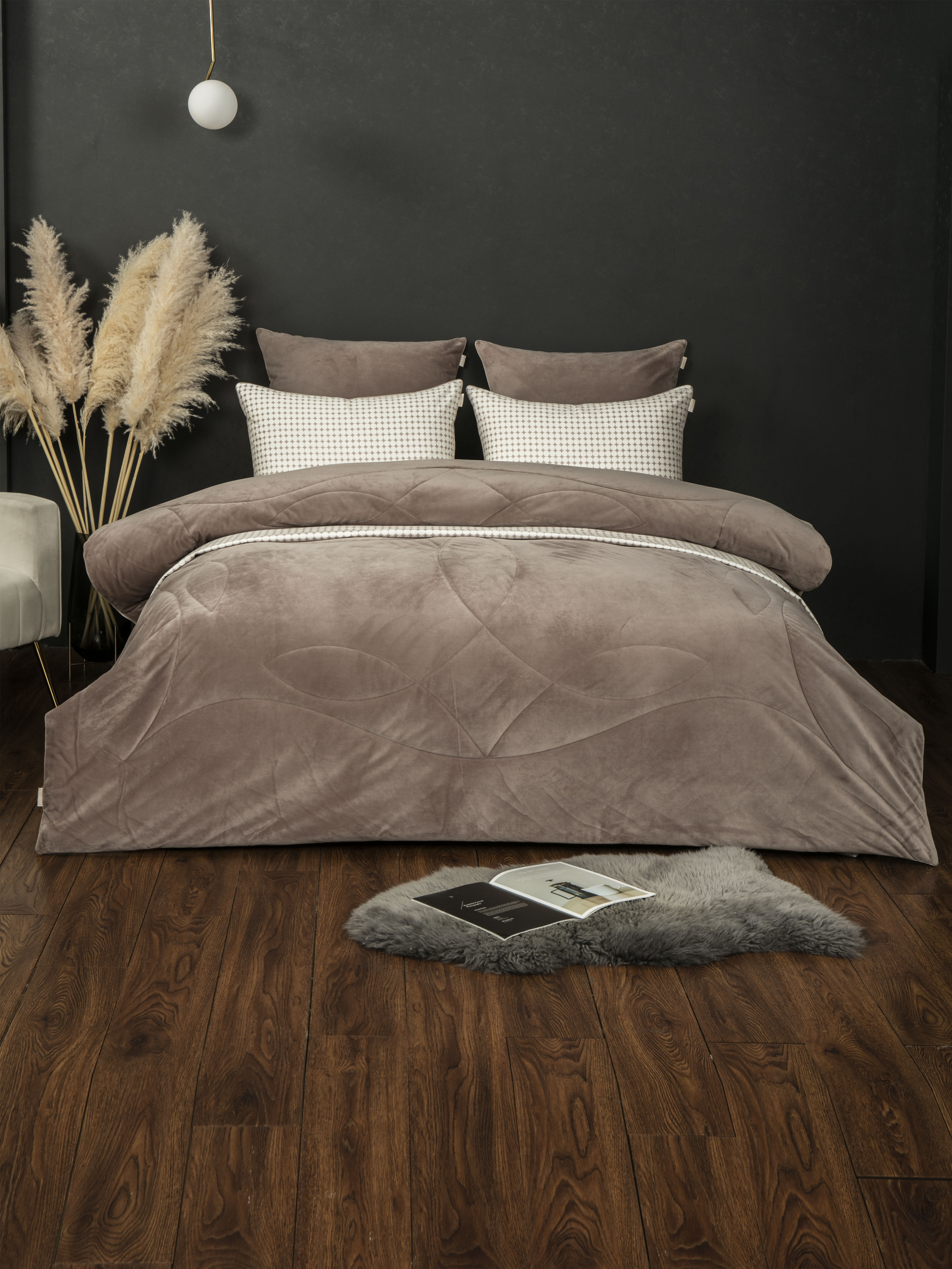 Одеяло: верхняя ткань – роскошный мягкий велюр, низ – высококачественный сатин — 100% хлопок. Наполнитель одеяла 100% микрогель. Сатиновая наволочка 50х70 — 100% хлопок. Наволочки 70х70 выполнены из комбинации нежного велюра и сатина. Простынь выполнена из сатина — 100% хлопок.