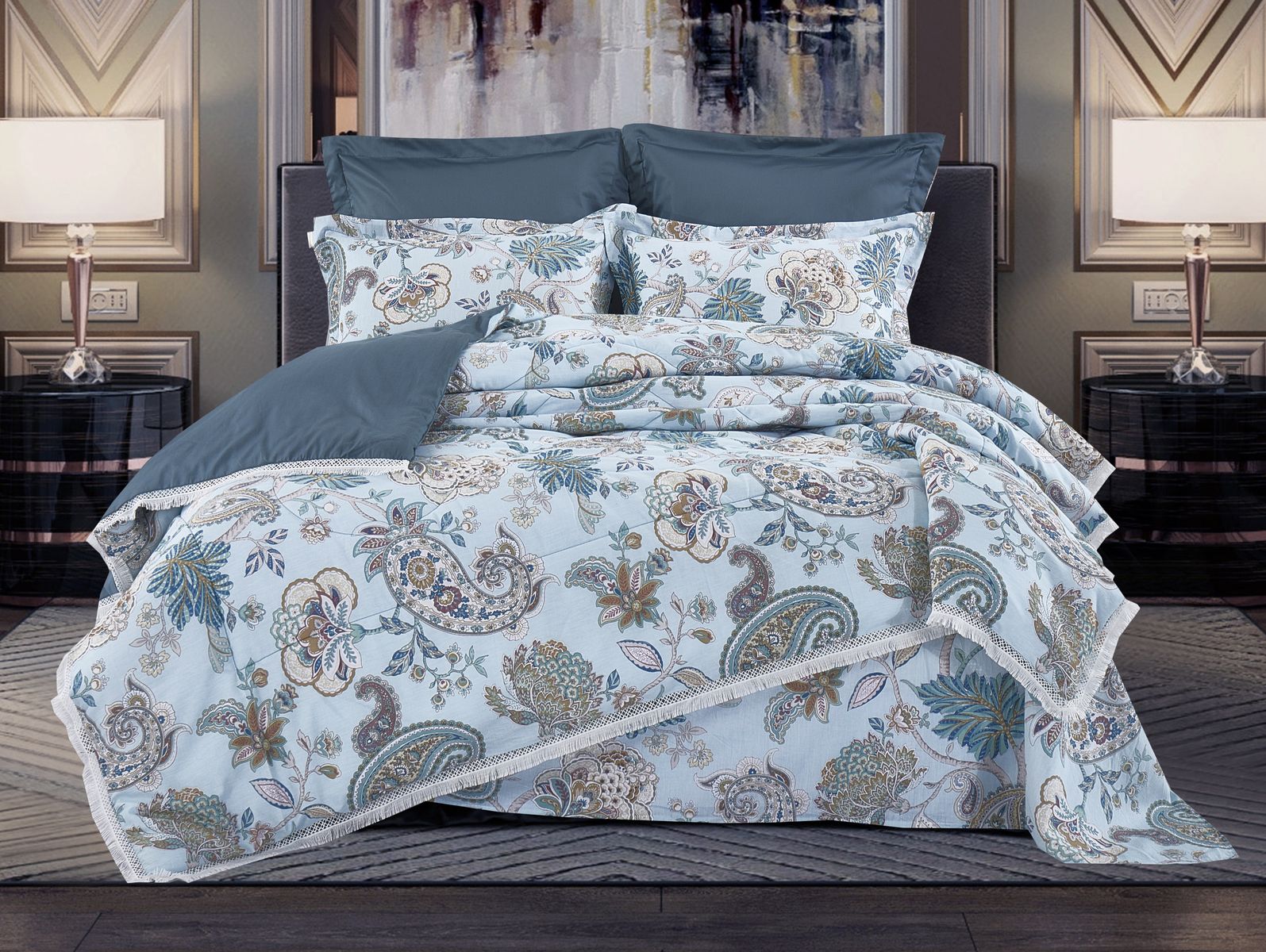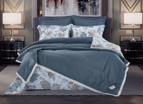 Всесезонная коллекция «Dolce Fiore Egypt Cotton» представляет собой комплекты постельного белья и легких двусторонних одеял, в комбинации цветного и однотонного сатина высокого качества. Комплект состоит из  легкого двустороннего одеяла, с оригинальным дизайном стежки, отделанное кружевом с бахрамой с 3х сторон. Легко стирается, не требует глажки, быстро высыхает, что позволяет пользоваться им в любое время года.