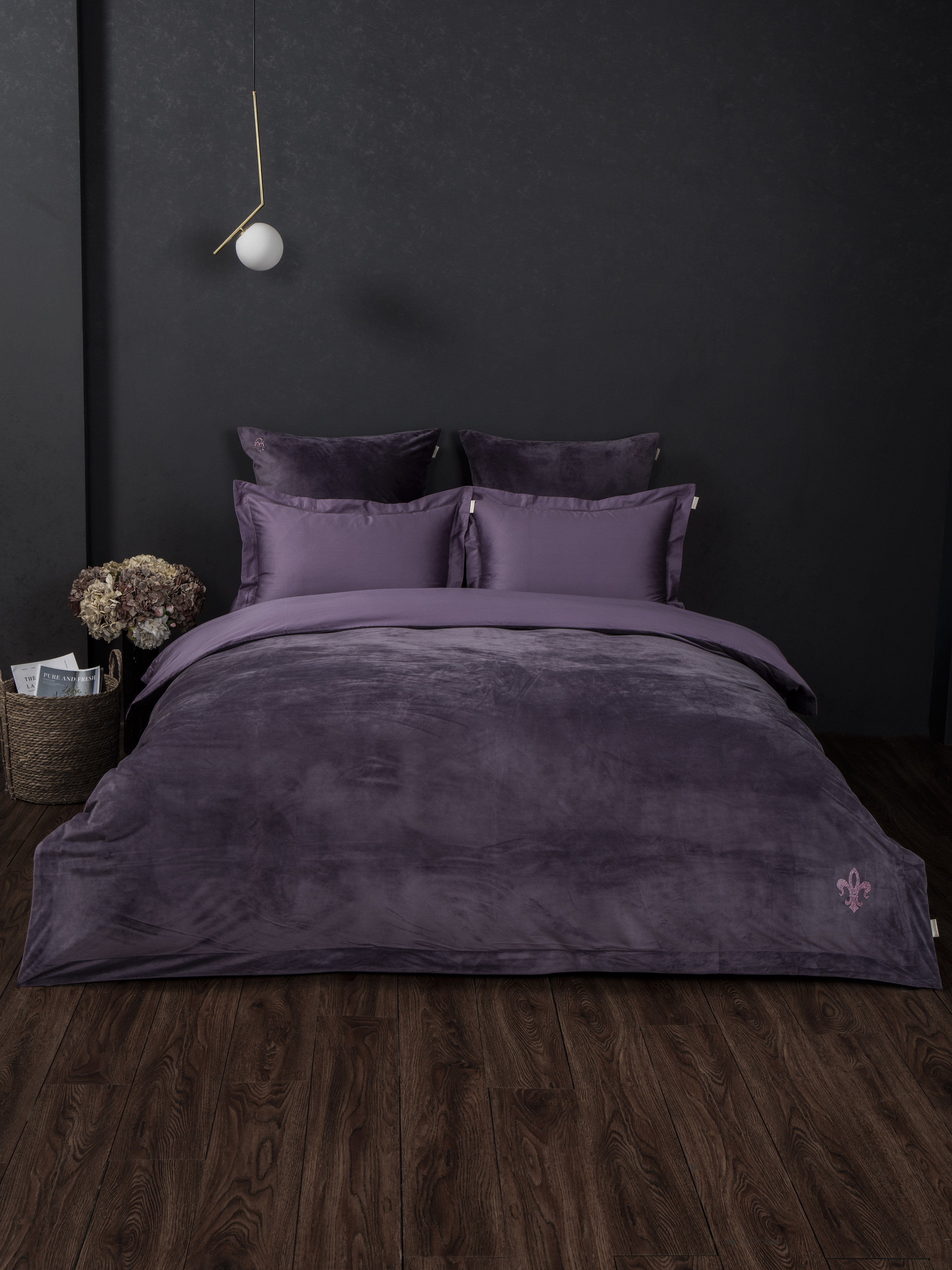 Пледодеяльник: верхняя ткань – роскошный мягкий велюр, низ – однотонный высококачественный сатин, украшен фирменным гербом из качественных страз, нанесенными высокотемпературным способом. Уникальность пледодеяльника, в возможности использовать его зимой в жарких спальнях, как облегающую простыню, в прохладных — с вложением одеяла, летом и в межсезонье – в качестве легкого одеяла как самостоятельный предмет!