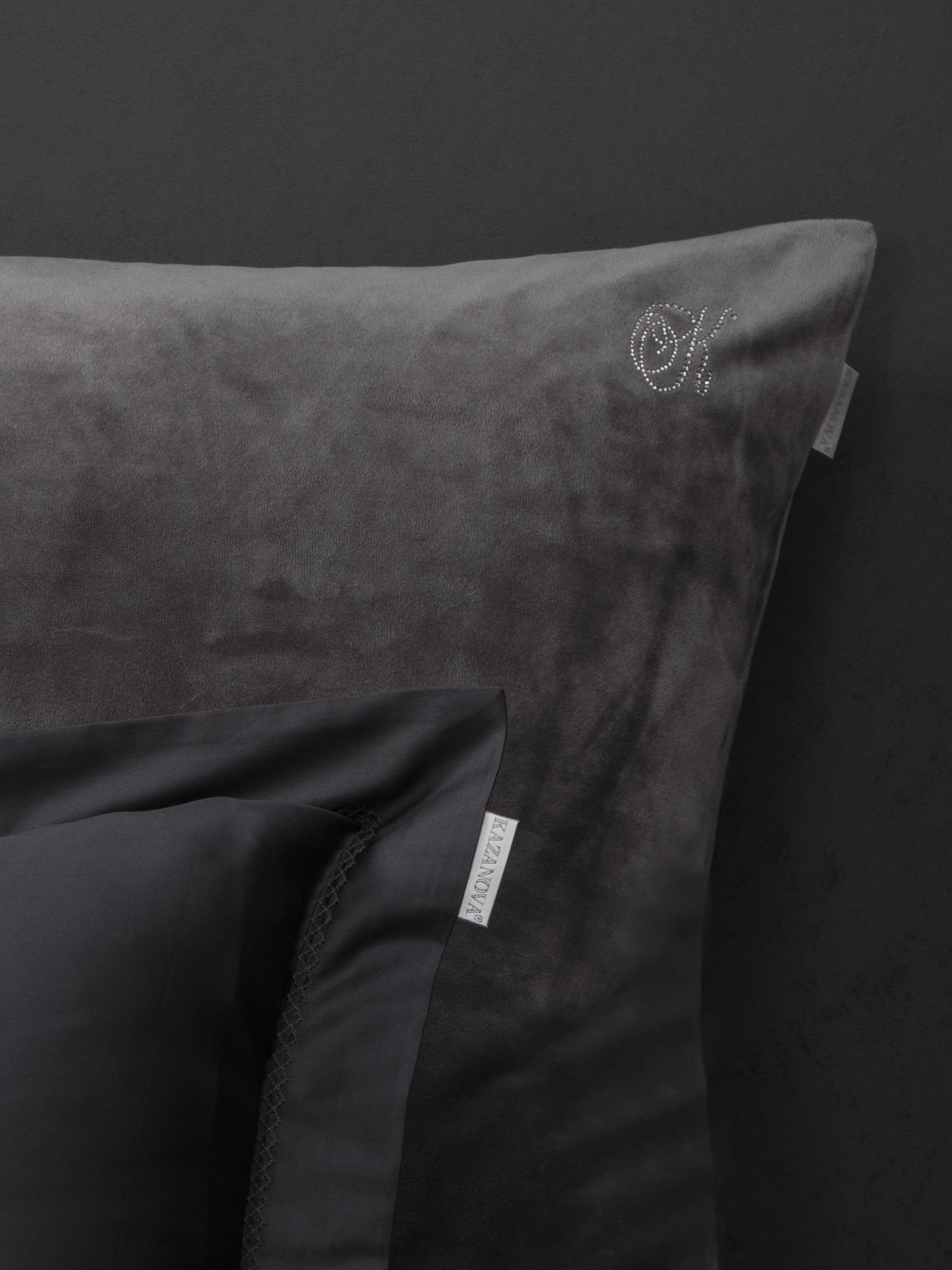 Сатиновая наволочка 50х70 отделана изящной вышивкой. Наволочки 70х70 выполнены из комбинации нежного велюра и сатина, украшены стразами в форме буквы К. Простынь выполнена из сатина. Доступные цвета: бежевый, капучино, мави.