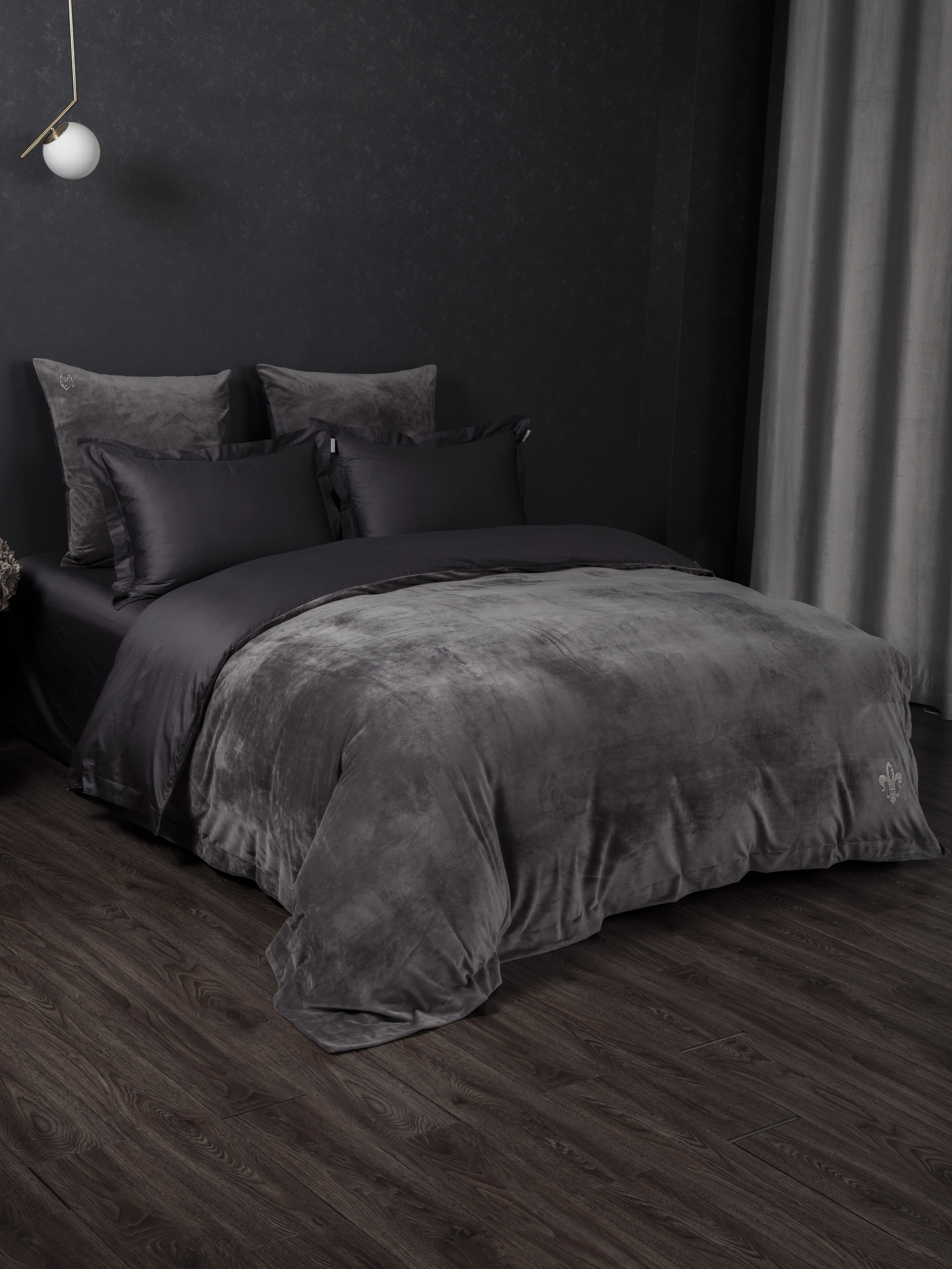 Пледодеяльник: верхняя ткань – роскошный мягкий велюр, низ – однотонный высококачественный сатин, украшен фирменным гербом из качественных страз, нанесенными высокотемпературным способом. Уникальность пледодеяльника, в возможности использовать его зимой в жарких спальнях, как облегающую простыню, в прохладных — с вложением одеяла, летом и в межсезонье – в качестве легкого одеяла как самостоятельный предмет!