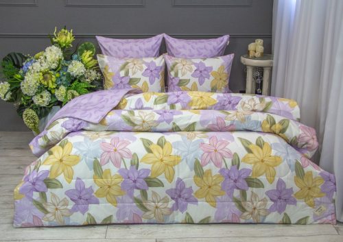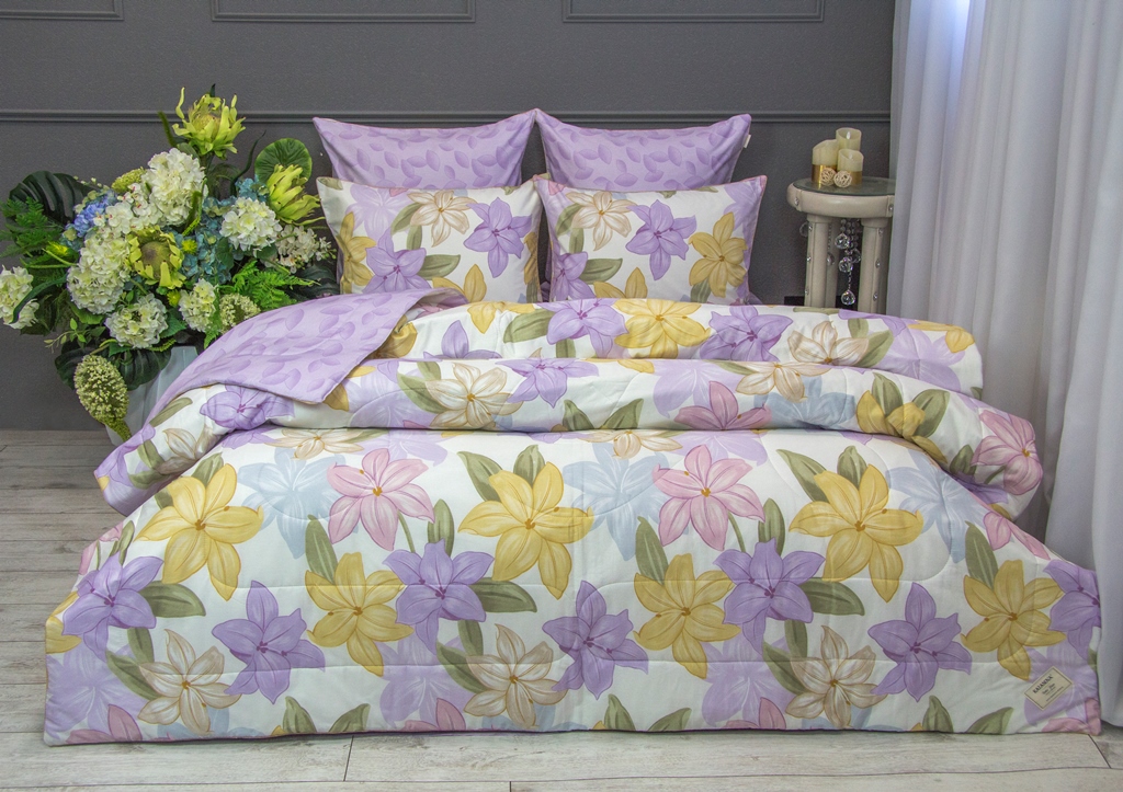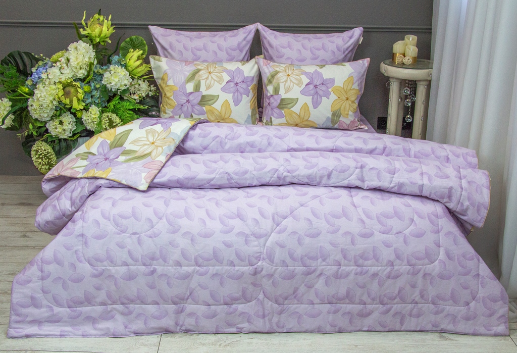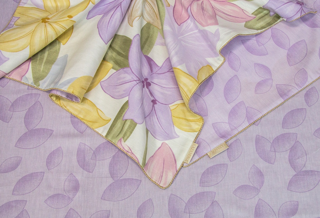Всесезонная коллекция «Dolce Fiore Cotton» представляет собой комплекты постельного белья и легких двусторонних одеял, в комбинации цветного и однотонного сатина высокого качества. Комплект состоит из легкого двустороннего одеяла, с оригинальным дизайном стежки, отделанное кружевом с бахрамой с 3х сторон. Легко стирается, не требует глажки, быстро высыхает, что позволяет пользоваться им в любое время года.