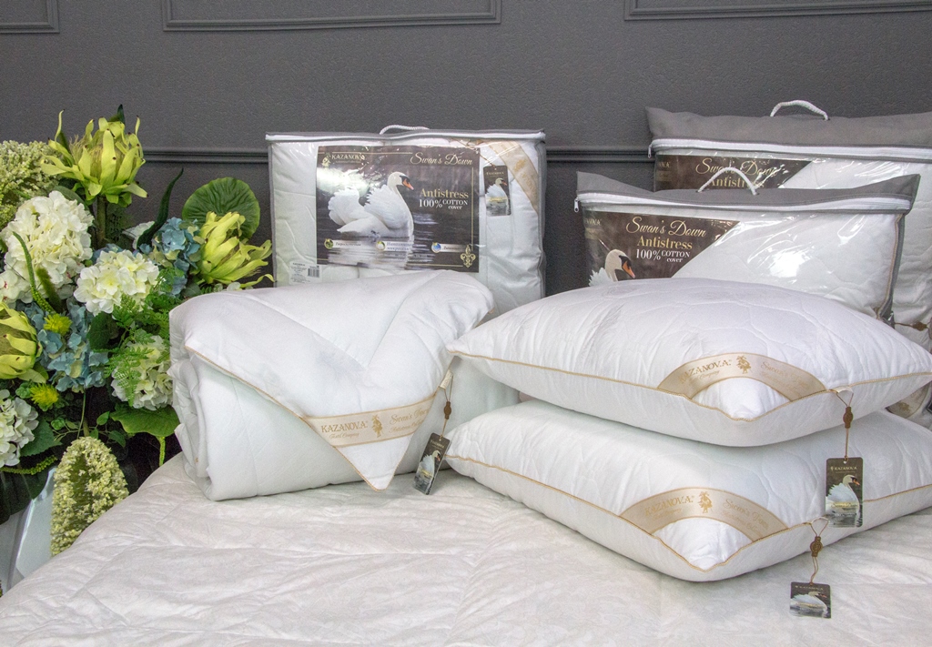 Коллекция Luxury Antistress Collection Swans Down. Мы создали для Вас уникальную коллекцию подушек и одеял как в дорогих отелях, по очень привлекательной цене. Чехол подушек и одеял полностью простеган и выполнен из жаккардового египетского хлопка. Наполнитель подушки и одеял 100% микрогель, обработанный ионами серебра. Элементами отделки служат: витой жаккардовый кант по всему периметру подушек и одеял, и шелковистая угловая лента с логотипом компании KAZANOV.A.