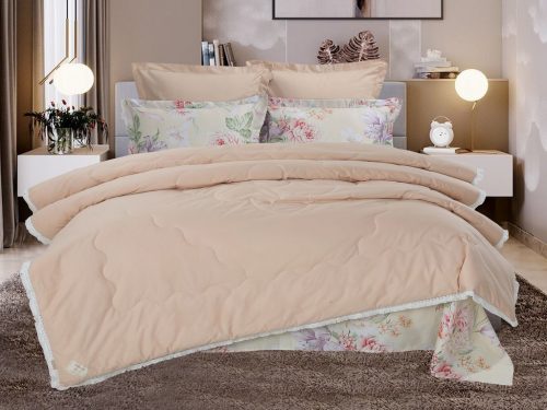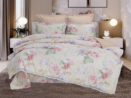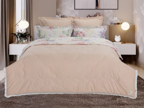 Всесезонная коллекция «Dolce Fiore Cotton» представляет собой комплекты постельного белья и легких двусторонних одеял, в комбинации цветного и однотонного сатина высокого качества. Комплект состоит из  легкого двустороннего одеяла, с оригинальным дизайном стежки, отделанное кружевом с бахрамой с 3х сторон. Легко стирается, не требует глажки, быстро высыхает, что позволяет пользоваться им в любое время года. Наполнитель: благодаря миксу органического волокна льна и экофайбера, обладает невесомыми и облегающими свойствам, хорошей воздупроницаемостью и терморегуляцией.