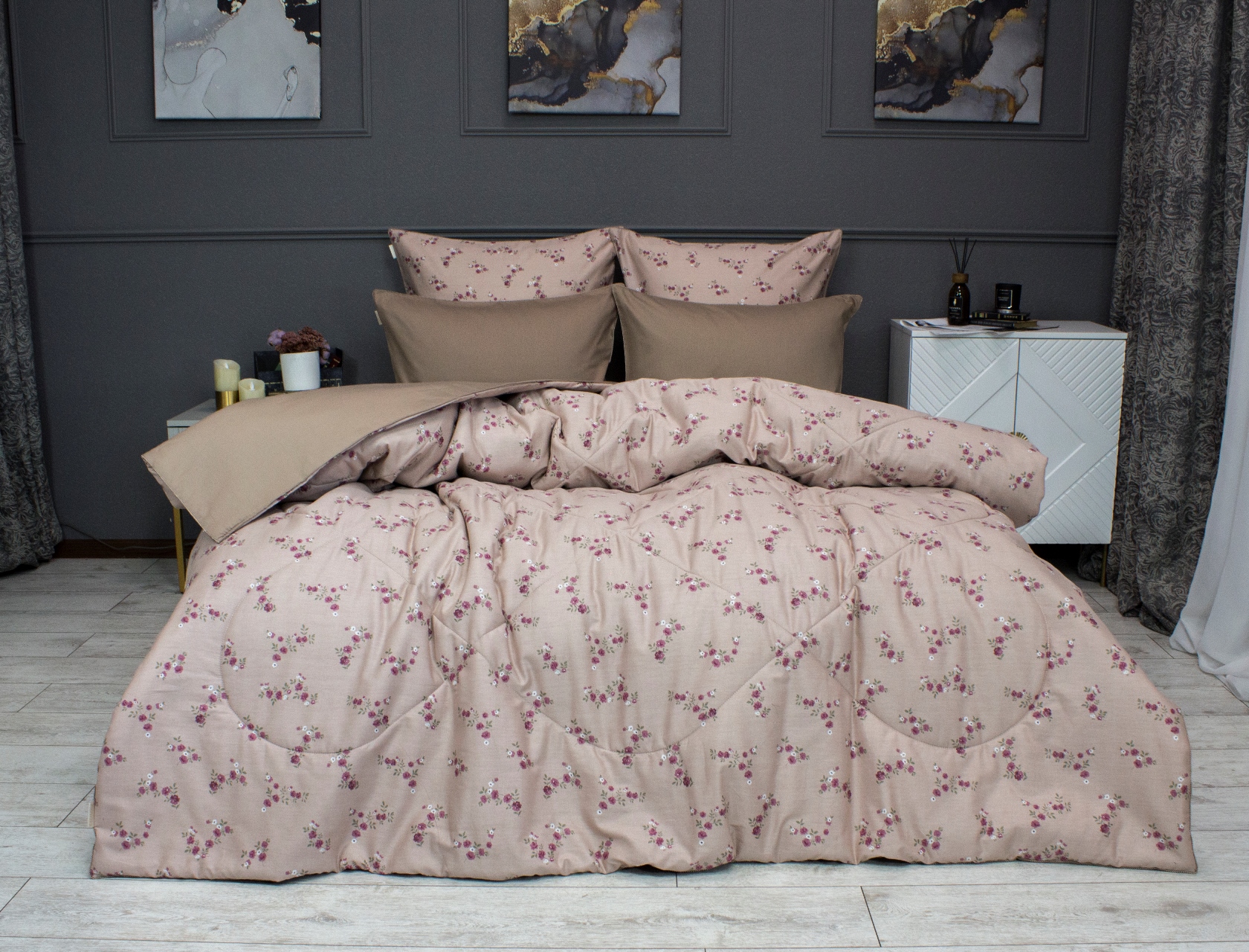 Всесезонная коллекция «Dolce Fiore Cotton» представляет собой комплекты постельного белья и легких двусторонних одеял, в комбинации цветного и однотонного сатина высокого качества. Комплект состоит из  легкого двустороннего одеяла, с оригинальным дизайном стежки, отделанное кружевом с бахрамой с 3х сторон. Легко стирается, не требует глажки, быстро высыхает, что позволяет пользоваться им в любое время года. Наполнитель: благодаря миксу органического волокна льна и экофайбера, обладает невесомыми и облегающими свойствам, хорошей воздупроницаемостью и терморегуляцией.