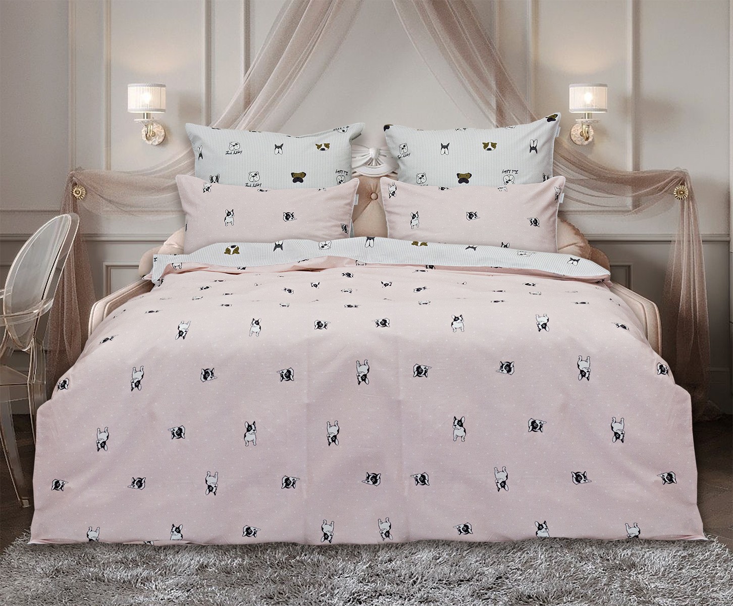 Пододеяльник 155*210 — 1 шт. Простыня 160*220 — 1 шт. Наволочка 50*70 — 1 шт. и 70*70 — 1 шт.