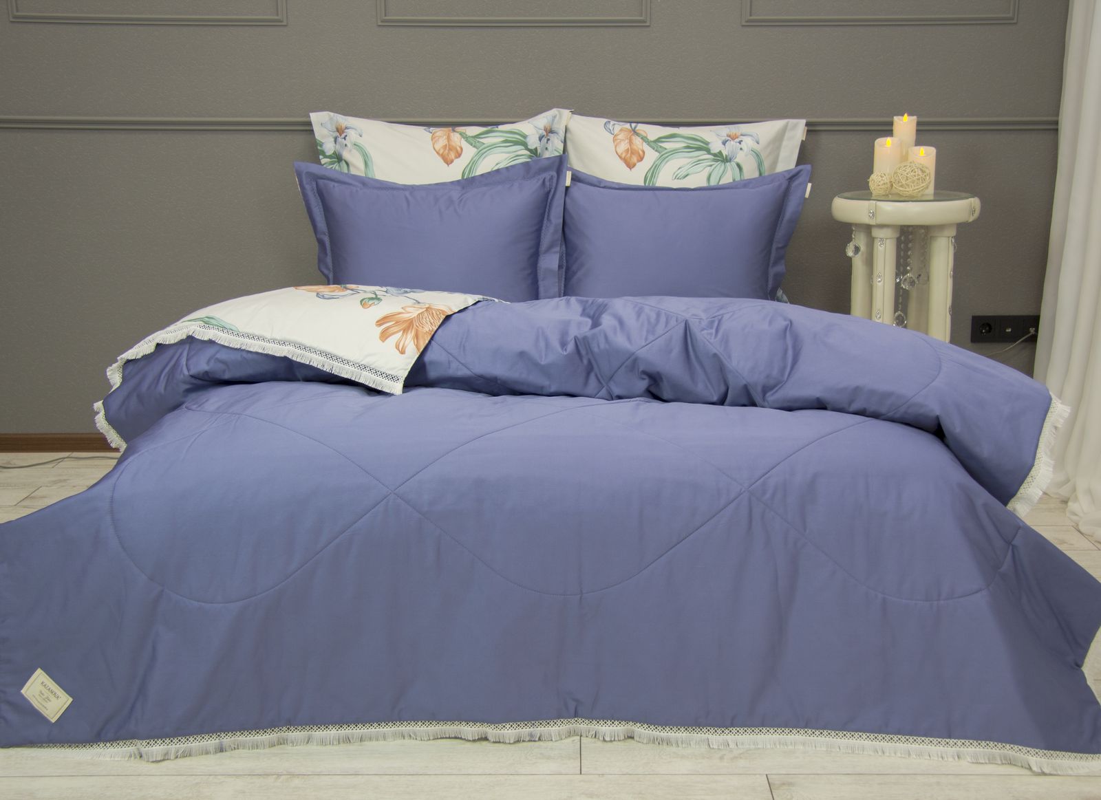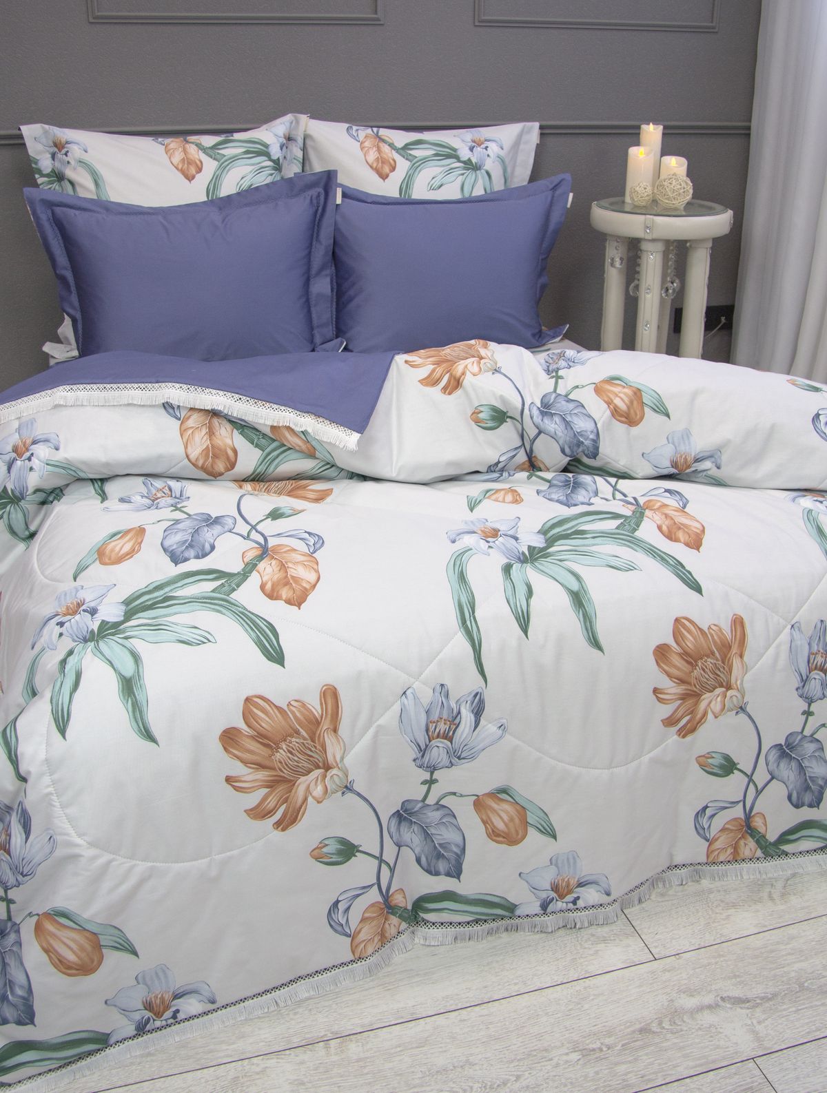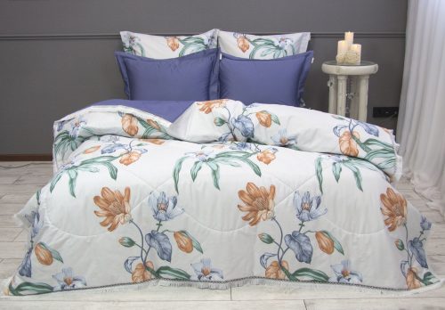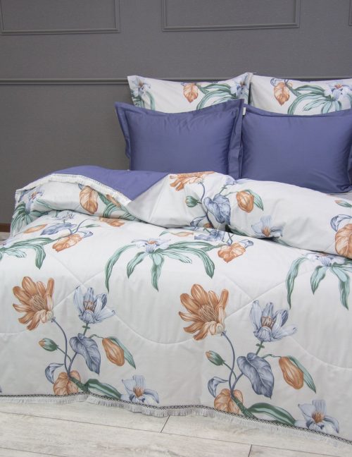 Всесезонная коллекция «Dolce Fiore Egypt Cotton» представляет собой комплекты постельного белья и легких двусторонних одеял, в комбинации цветного и однотонного сатина высокого качества. Комплект состоит из  легкого двустороннего одеяла, с оригинальным дизайном стежки, отделанное кружевом с бахрамой с 3х сторон. Легко стирается, не требует глажки, быстро высыхает, что позволяет пользоваться им в любое время года.