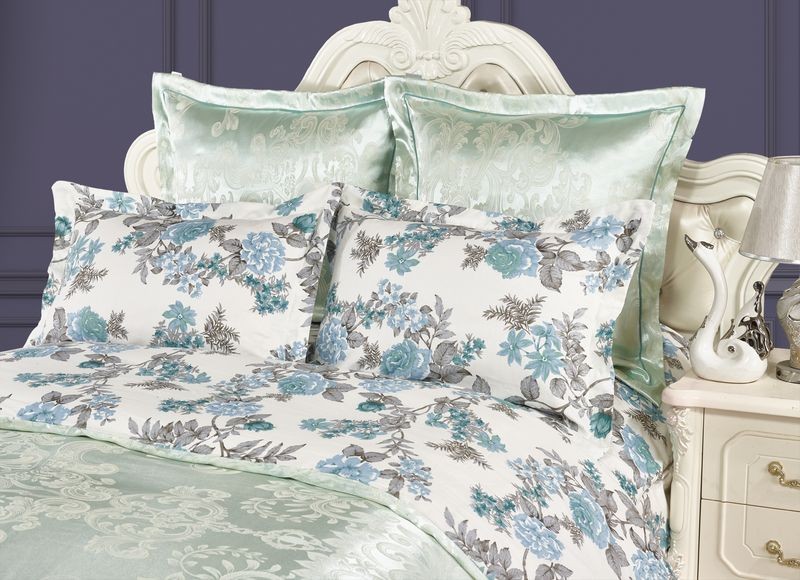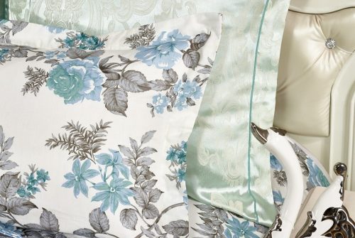Пододеяльник выполнен в комбинации: верх люксовый жаккард, низ принтованный сатин. Отделка: шов-вышивка с трех сторон на ушке 5 см.