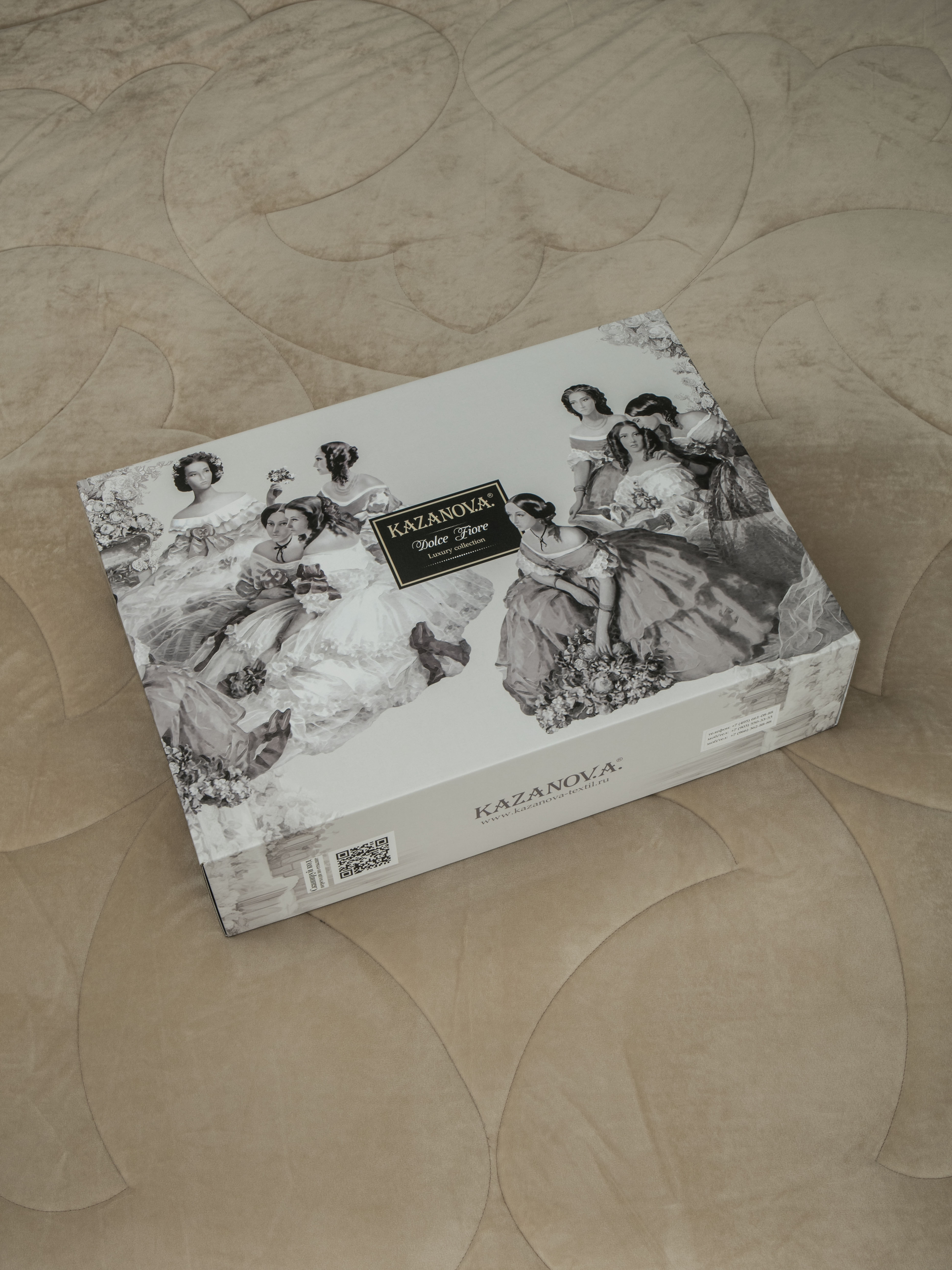 Комплекты изящно выложены в брендовую подарочную упаковку «KAZANOV.A.» с PVC ручкой.