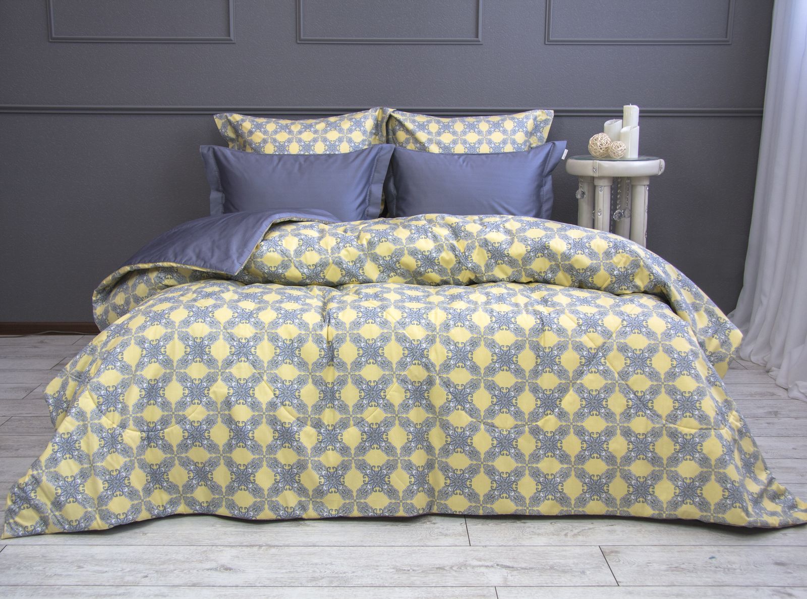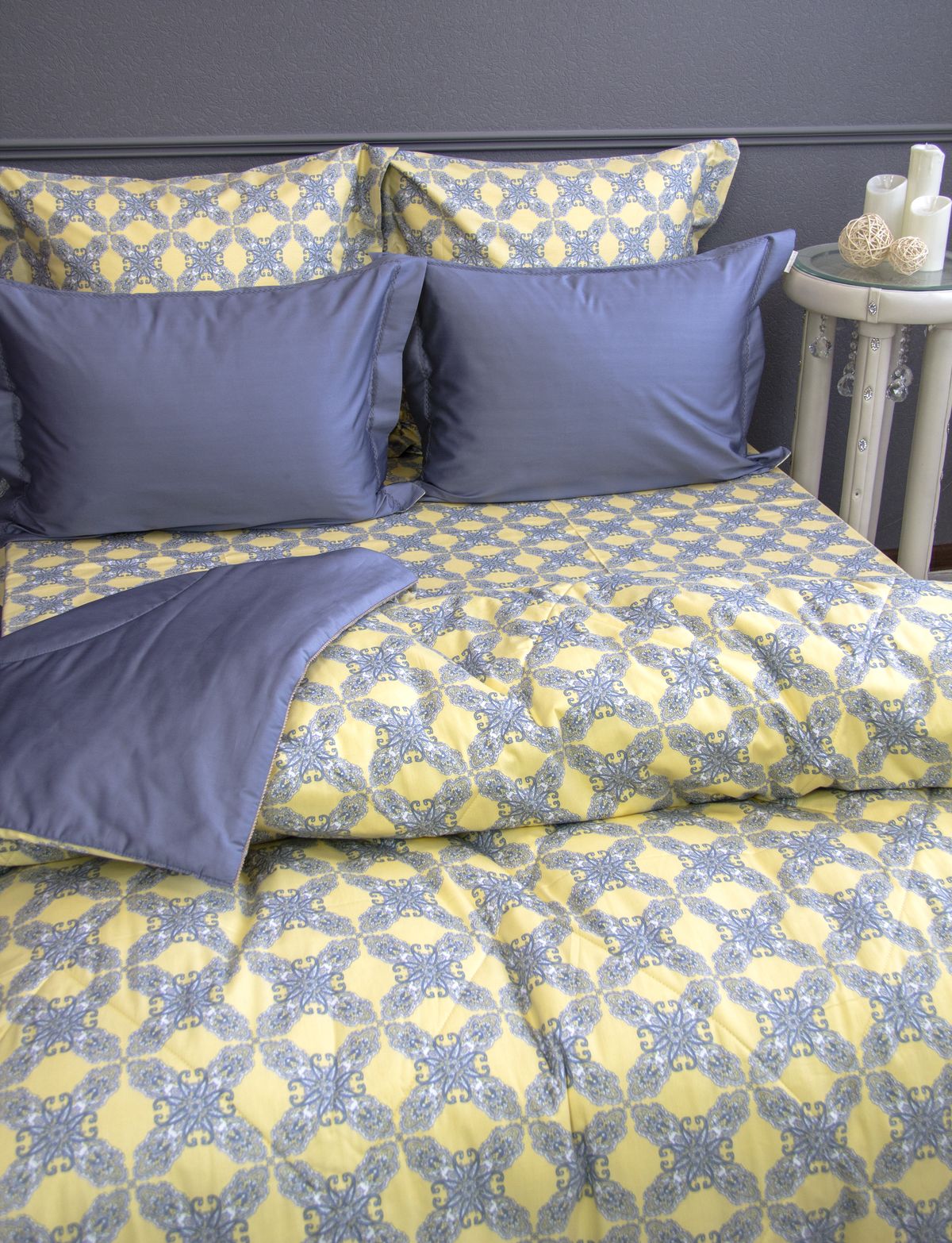 Всесезонная коллекция «Dolce Fiore Egypt Cotton» представляет собой комплекты постельного белья и легких двусторонних одеял, в комбинации цветного и однотонного сатина высокого качества. Комплект состоит из  легкого двустороннего одеяла, с оригинальным дизайном стежки, отделанное кружевом с бахрамой с 3х сторон. Легко стирается, не требует глажки, быстро высыхает, что позволяет пользоваться им в любое время года.