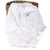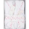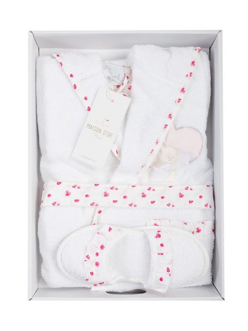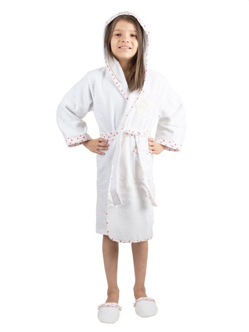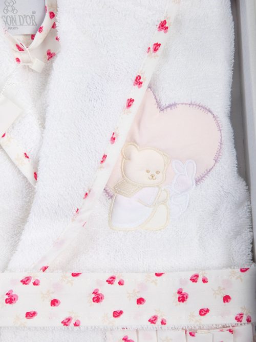 Очаровательный банный комплект Alpha для девочек состоящий из детского халата и тапочек, подарит малышу настоящее удовольствие. Пушистый махровый халатик с капюшоном, на пояске (пришит со спины), сбоку имеется 1 накладной кармашек. На груди украшение в виде объемной аппликации. По краю кармана, застежки, капюшона и по манжеты рукава — декоративная вставка из ткани. Махровые детские тапки мягкие, удобные. Так же присутствует декоративная вставка тканью.