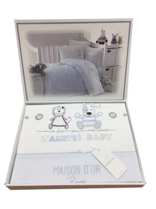 внешняя сторона – белый батист, голубого кант из однотонного материала + кант в мелкую полоску. По центру пододеяльника – объемная мягкая аппликация. Внутренняя сторона – однотонный белый материал. Скрытая застежка снизу, на металл. кнопках.