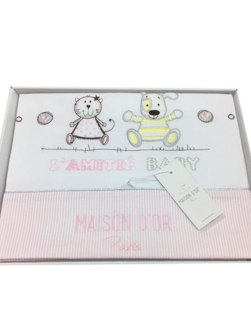 внешняя сторона – белый батист, розовый кант из однотонного материала + кант в мелкую полоску. По центру пододеяльника – объемная мягкая аппликация. Внутренняя сторона – однотонный белый материал. Скрытая застежка снизу, на металл. кнопках.