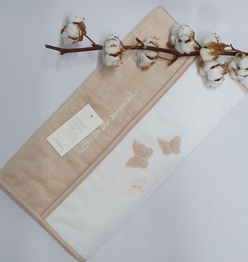 Махровое полотенце с оригинальным рисунком в виде обьемных бабочек и вышивкой . Это полотенце очень мягкое, пушистое и приятное к телу. 100% микро-хлопок высшей категории. Великолепно впитывает влагу, легко стирается.