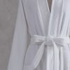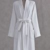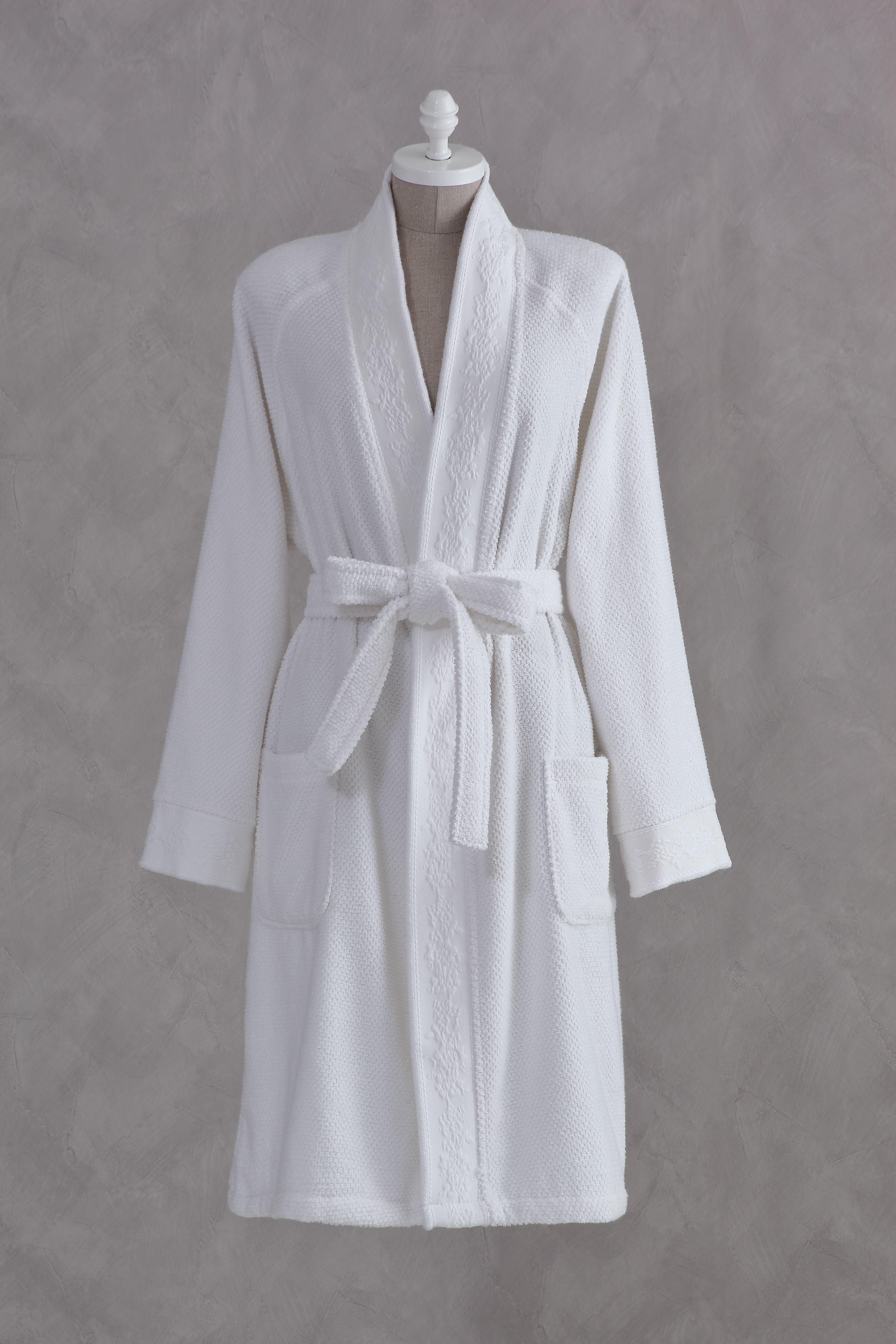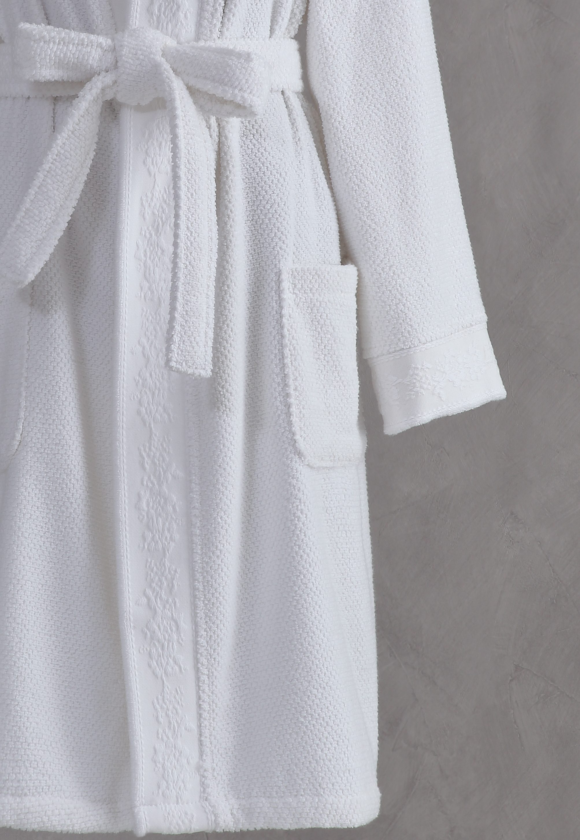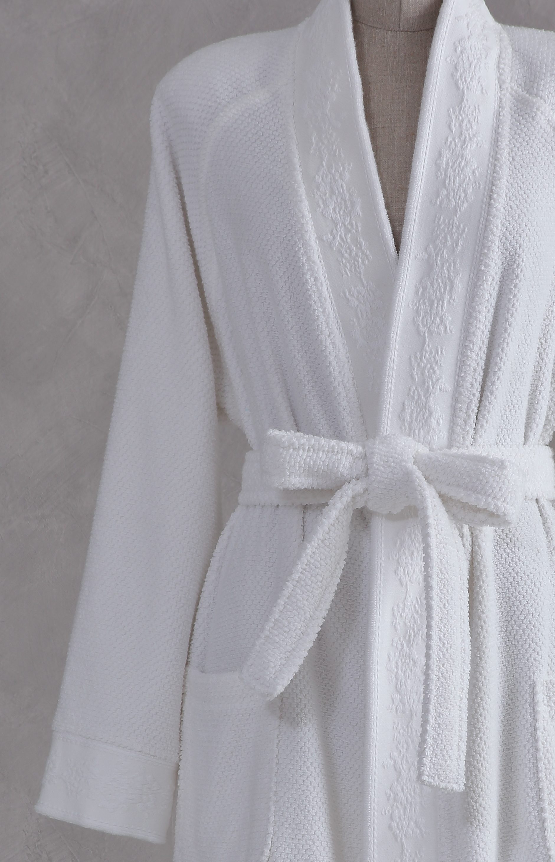 Красивая модель женского махрового халата в романтичном оформление, дополнит нежный женский образ своей утонченностью форм и отменным качеством. Халат средней длины, классическая форма с застежкой на запахе, линия талии подчеркнута съемным поясом, два накладных боковых кармана. Линия ворота, манжеты, край карманов декорированы вышивкой. Данная модель выполнена из качественного натурального хлопка, обладает хорошей плотностью, мягкостью, с фактурными короткими ворсовыми ячейками.