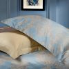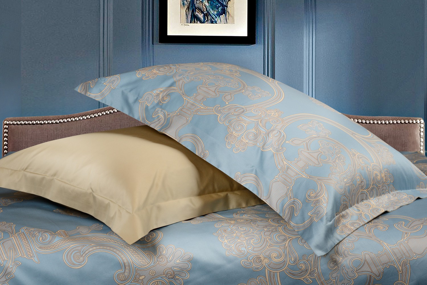 Christy — это очень красивый комплект постельного белья в серо-голубых тонах с элегантным контрастным орнаментом. Обратная сторона наволочек, пододеяльника и простыня выполнены в ткани компаньоне бежевого цвета.