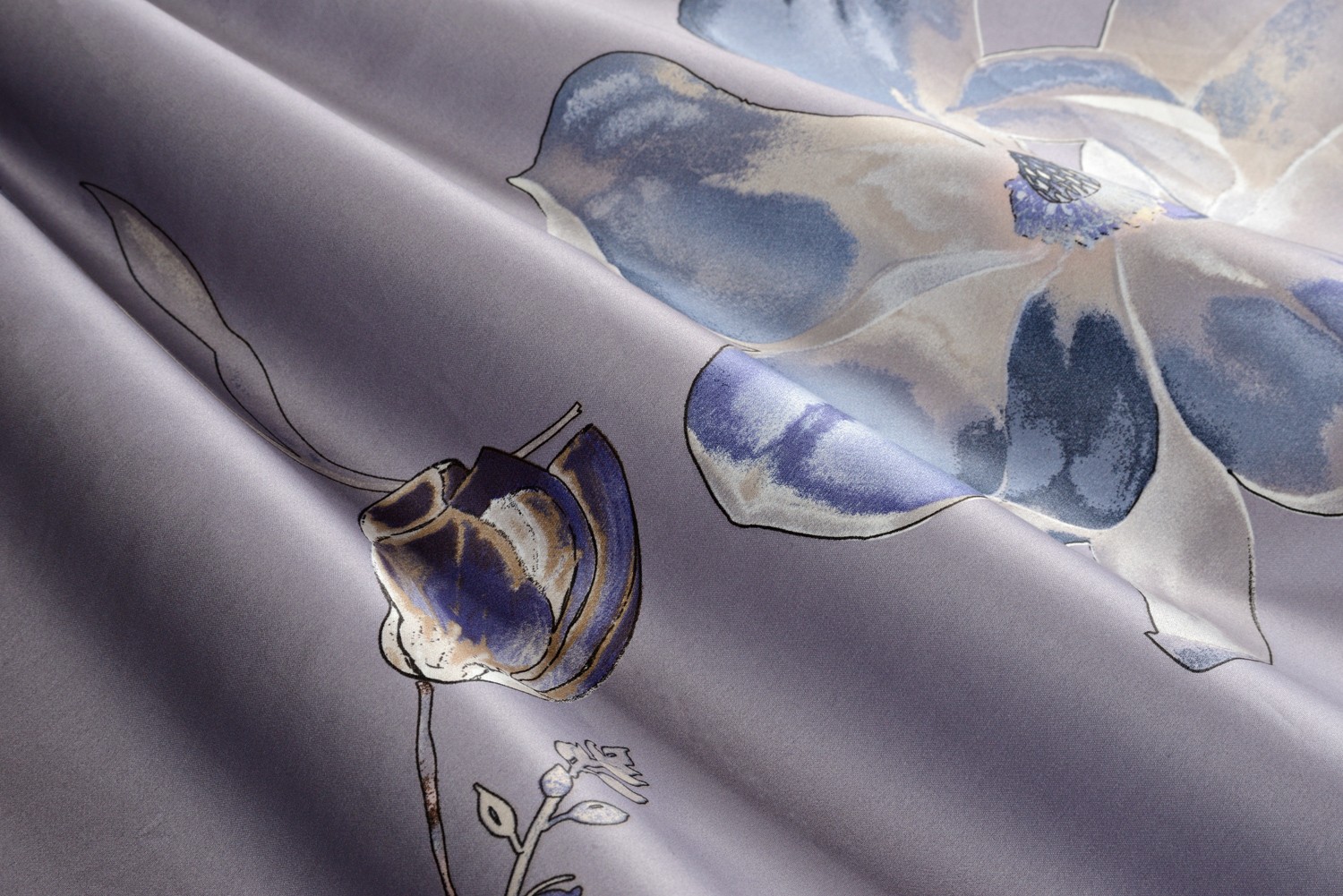 Magnolia night изготовлен из сатина плотностью 500 нитей/дюйм с двойной скрученной нитью, что делает ткань очень плотной, но в тоже время мягкой и приятной к телу. Еще одной отличительной особенностью этого постельного белья является хлопок из которого оно сделано. Это 100% длинноволокнистый Пима хлопок, один из лучших сортов на планете.