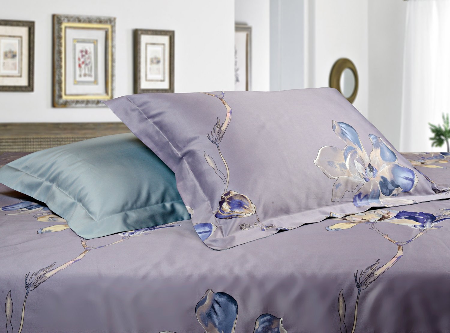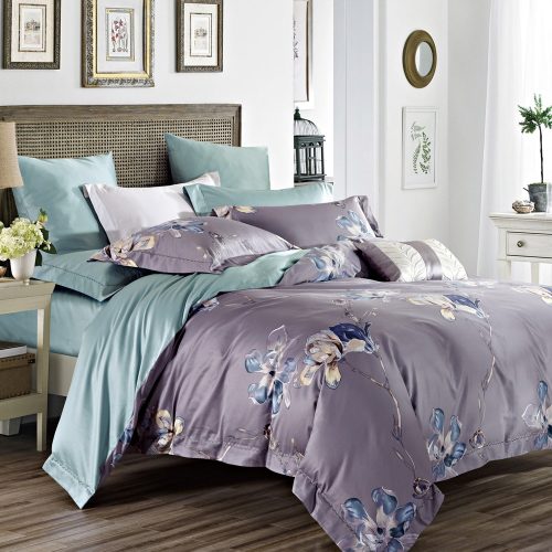 Magnolia night — комплект постельного белья с красивым флористическим орнаментом. Обратная сторона наволочек, пододеяльника и простыня выполнены в ткани компаньоне бледно-зеленого цвета.