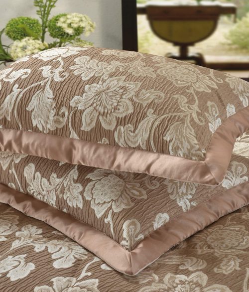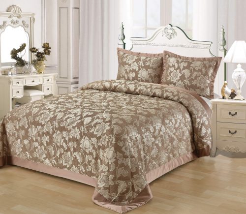 Стеганое, жаккардовое покрывало на подкладке из плотной декоративной ткани. Отличительной особенностью данной модели является её оригинальный жаккардовый рисунок. Данное стеганое покрывало представляет собой многослойное изделие, внешняя часть изделия состоит из жаккардового полотна, а внутренний наполнитель состоит из силиконизированного волокна плотность которго составляет 100г/м2. Для того, чтобы внутренний слой не сбивался в комки и создать фактурность внешних слоев, по всей площади покрывала производится простежка (прошивание). Это могут быть ровные линии или фантазийные узоры.