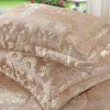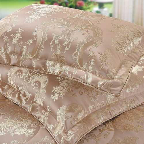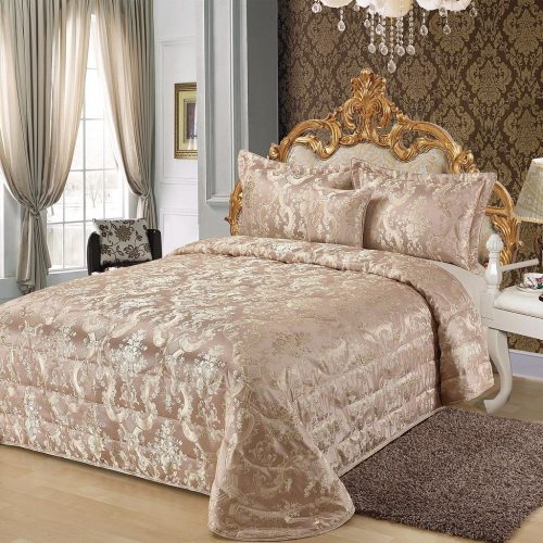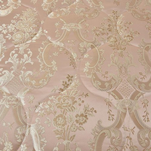 Стеганое, жаккардовое покрывало на подкладке из плотной декоративной ткани. Отличительной особенностью данной модели является её оригинальный жаккардовый рисунок. Данное стеганое покрывало представляет собой многослойное изделие, внешняя часть изделия состоит из жаккардового полотна, а внутренний наполнитель состоит из силиконизированного волокна плотность которго составляет 100г/м2. Для того, чтобы внутренний слой не сбивался в комки и создать фактурность внешних слоев, по всей площади покрывала производится простежка (прошивание). Это могут быть ровные линии или фантазийные узоры.