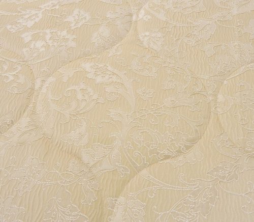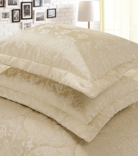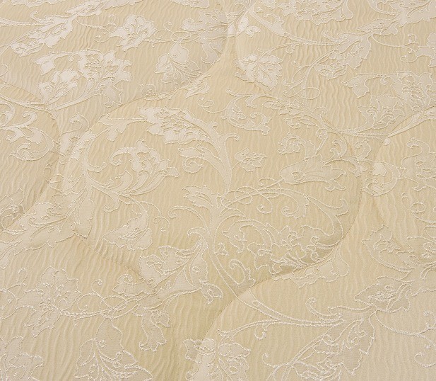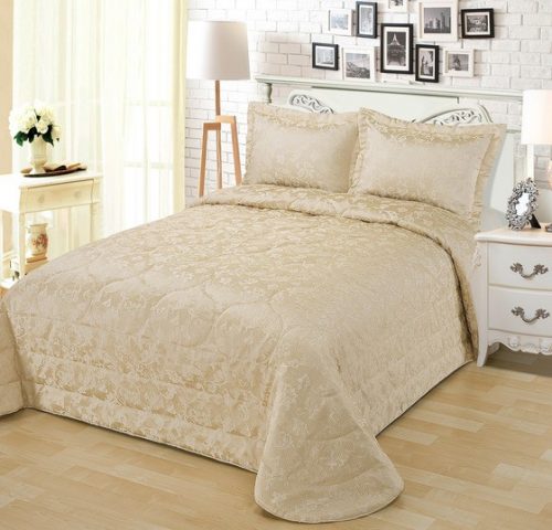 Стеганое, жаккардовое покрывало на подкладке из плотной декоративной ткани. Отличительной особенностью данной модели является её оригинальный жаккардовый рисунок. Данное стеганое покрывало представляет собой многослойное изделие, внешняя часть изделия состоит из жаккардового полотна, а внутренний наполнитель состоит из силиконизированного волокна плотность которго составляет 100г/м2. Для того, чтобы внутренний слой не сбивался в комки и создать фактурность внешних слоев, по всей площади покрывала производится простежка (прошивание). Это могут быть ровные линии или фантазийные узоры.