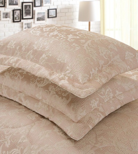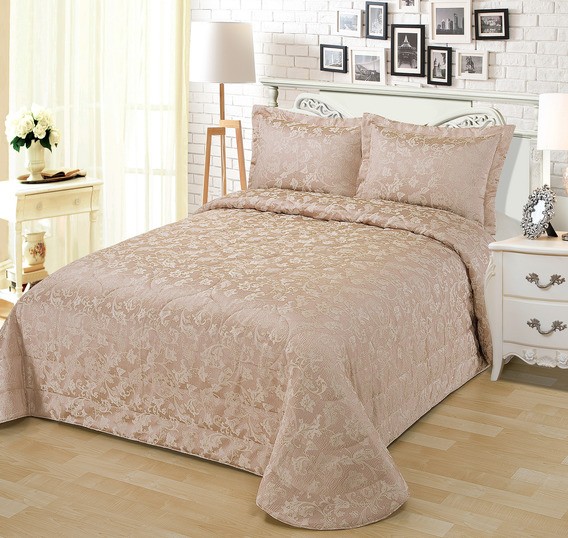 Стеганое, жаккардовое покрывало на подкладке из плотной декоративной ткани. Отличительной особенностью данной модели является её оригинальный жаккардовый рисунок. Данное стеганое покрывало представляет собой многослойное изделие, внешняя часть изделия состоит из жаккардового полотна, а внутренний наполнитель состоит из силиконизированного волокна плотность которго составляет 100г/м2. Для того, чтобы внутренний слой не сбивался в комки и создать фактурность внешних слоев, по всей площади покрывала производится простежка (прошивание). Это могут быть ровные линии или фантазийные узоры.