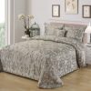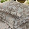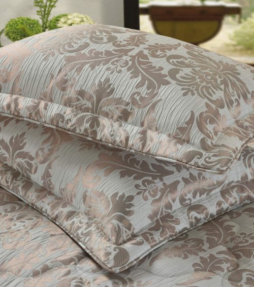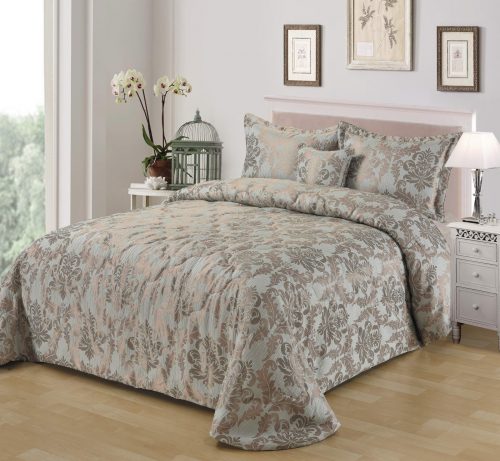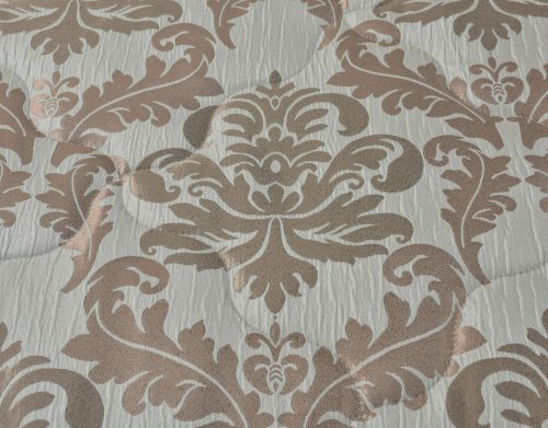 Стеганое, жаккардовое покрывало на подкладке из плотной декоративной ткани. Отличительной особенностью данной модели является её оригинальный жаккардовый рисунок. Данное стеганое покрывало представляет собой многослойное изделие, внешняя часть изделия состоит из жаккардового полотна, а внутренний наполнитель состоит из силиконизированного волокна плотность которго составляет 100г/м2. Для того, чтобы внутренний слой не сбивался в комки и создать фактурность внешних слоев, по всей площади покрывала производится простежка (прошивание). Это могут быть ровные линии или фантазийные узоры.